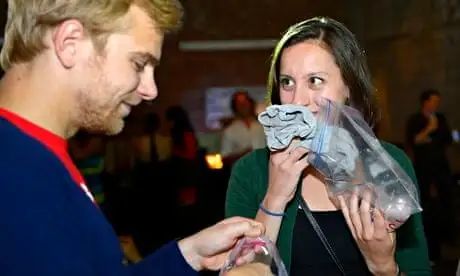 但人类是否有信息素还存在争议,但我们可以肯定的是有一部分人确实是迷恋气味的,2010年,数十人聚集在纽约布鲁克林的一家画廊,互相闻对方没洗过的T恤衫。这不是一次恋物癖者的聚会,而是一次尝试通过体味吸引他人的活动。这次“信息素聚会”(Pheromone Party)的活动模式很简单:随意打开一个塞满脏衣服的包裹,然后闻一下就行了。如果你喜欢你闻到的气味,说不定还能和衣服的主人来上一场约会呢。