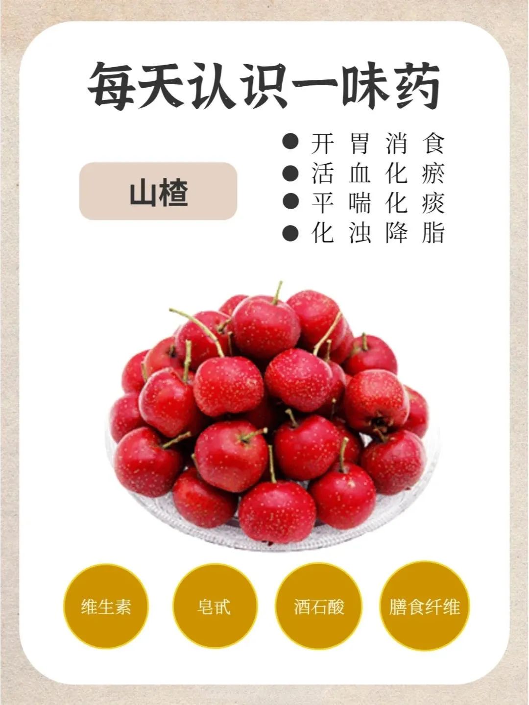 山楂酸甘微温,入肝、脾经,能活xue化瘀、消食去脂,很适合脂肪肝或血脂偏高的人群。