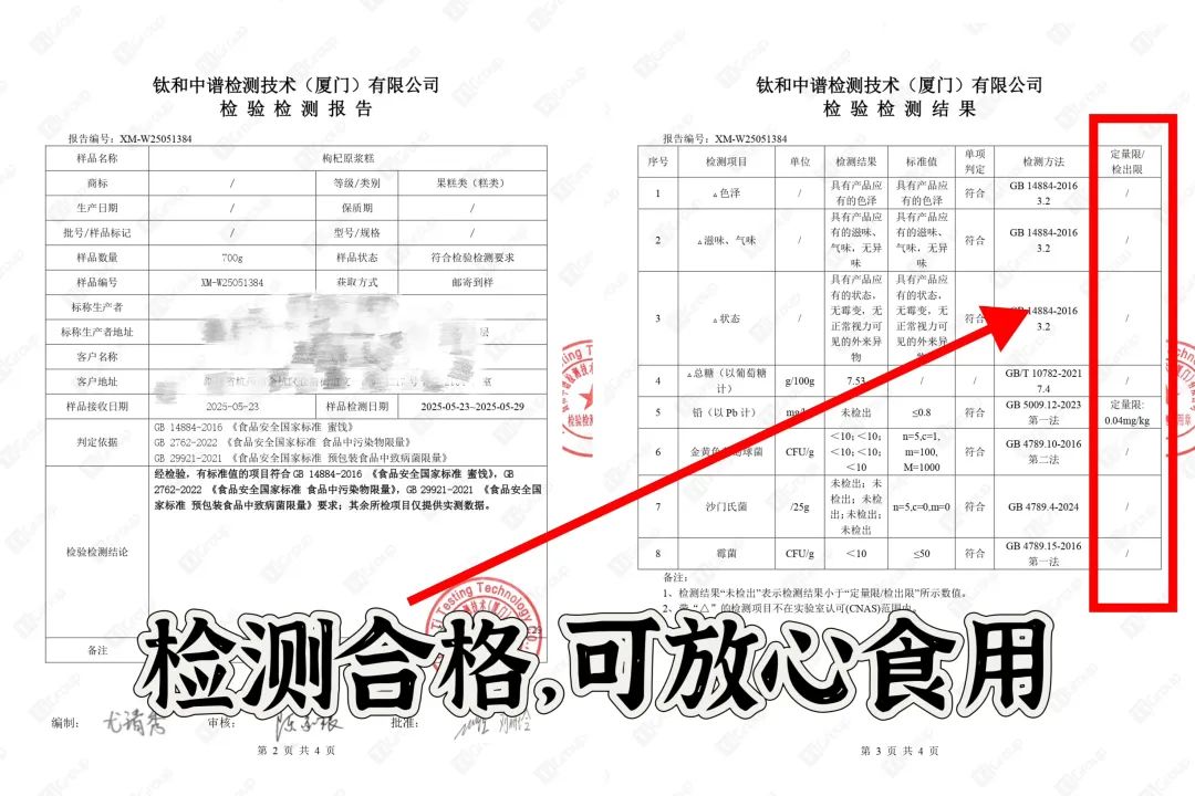 它还拥有没有添加防腐剂、没有添加香精、色素的质检报告,大家可以放心食用!!