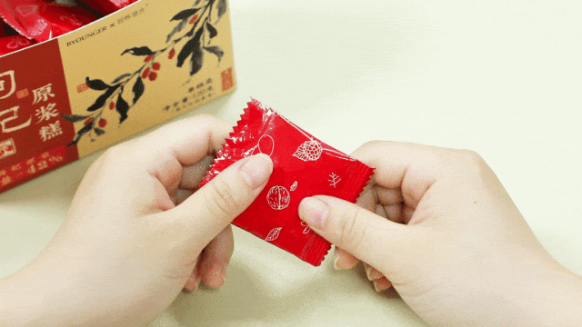 撕开包装就能吃,软糯香甜,质地柔软而富有弹性,一口下去是柔软的绵密感,浓郁的枸杞果香回味在齿间,还能感受到微微的鲜枸杞颗粒感。