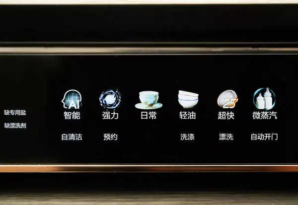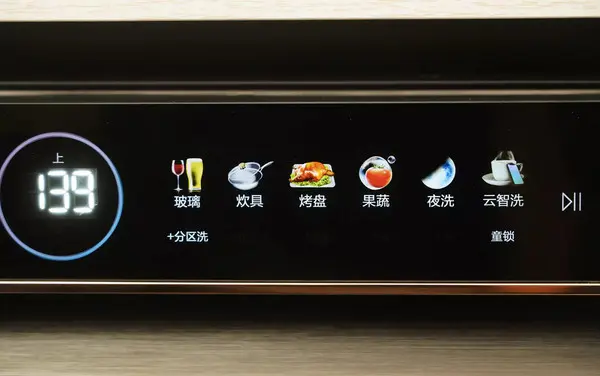 启动洗碗机,晶彩触控屏亮起,界面上可以看到它的主要功能,简单明了,老人也能轻松操作。