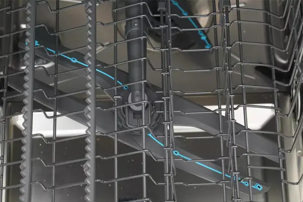 H型喷淋臂是这台洗碗机最重要的卖点,蓝色的一侧有几个小孔,用于冲刷上碗篮的餐具。