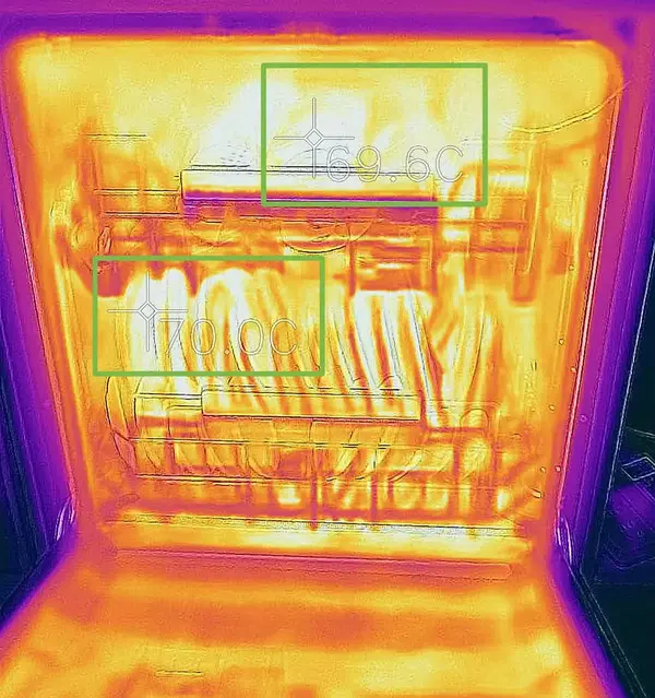 使用热成像观察一下高温煮洗时洗碗机里的餐具,最高已经超过70℃,进一步消毒杀菌。