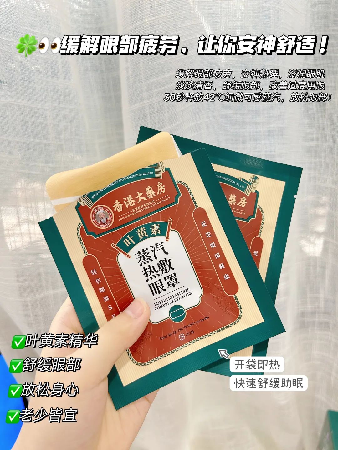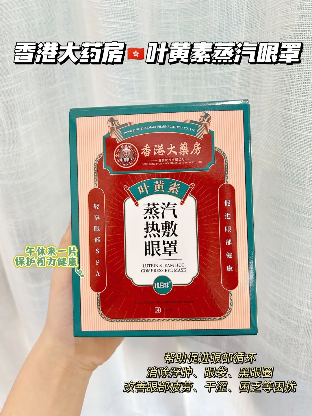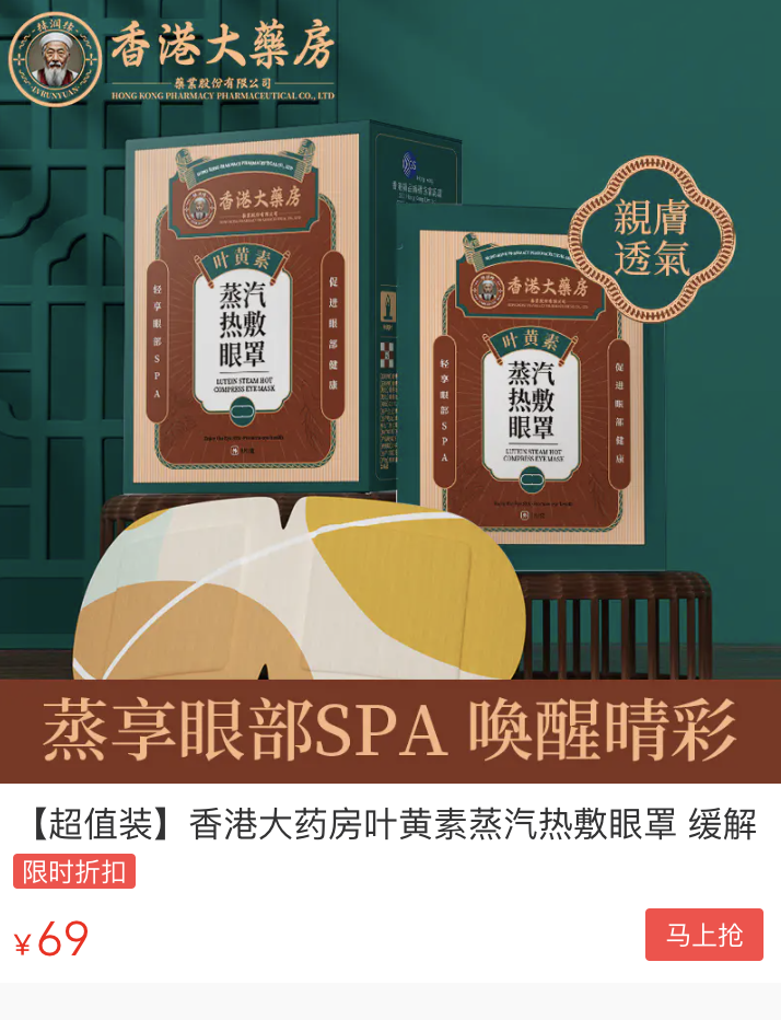 香港大药房这个品牌相信都不陌生,爷爷奶奶那辈就已经在用的老牌子了。香港大药房创建于1882年,已经有140年的历史,是香港最大的药房之一。这么多年以来,一直以来秉持着“炮炙虽繁,必不敢省人工,品味虽贵,必不敢减物力”的理念,从不以次充好,因而人民都信赖它。然而市面上生产销售的蒸汽眼罩就不敢苟同了,小作坊生产,要安全性没安全性,要效果没效果!大数据都显示香港大药房的价位、材质、抗蓝光、护眼功效,比大多数做眼部护理的品牌眼罩要好的多!今天我们争取到的这个优惠力度,你们也别担心有假,绝对正品保证!这款香港大药房蒸汽眼罩包装自带防伪码,一扫便知!真心只想让更多的朋友发现这个护眼宝藏!无限回购款,小编自己都囤了十盒。每天戴一下不仅解疲劳护视力,连睡觉都香香的~ 很多明星、达人都离不开的护眼神器,眼科博士真实测评,妥妥位居首位!手机党干眼星人必备!!闭眼入不会踩坑!