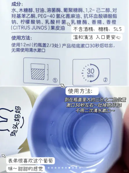 每次倒入瓶盖的三分之二漱口30s左右即可