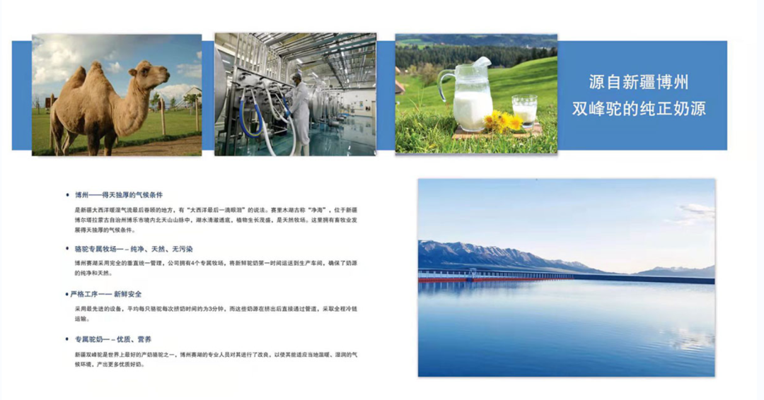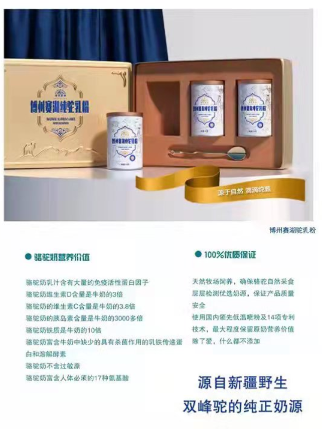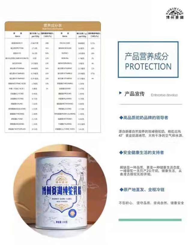 博乐市贝林乡富民棉农服务专业合作社与双河市迪彩骆驼养殖合作社合作(以下简称兵地联合社)生产的“博州赛湖鲜驼奶”和“博州赛湖纯驼乳粉”产品、以口感好、营养丰富的纯天然有机驼乳而闻名博州各地,在市场上享有较高的知名度,具有良好的口碑。已在内地和博乐市周边地区占据一定的市场,赢得了消费者的青睐,产品市场前景广阔。