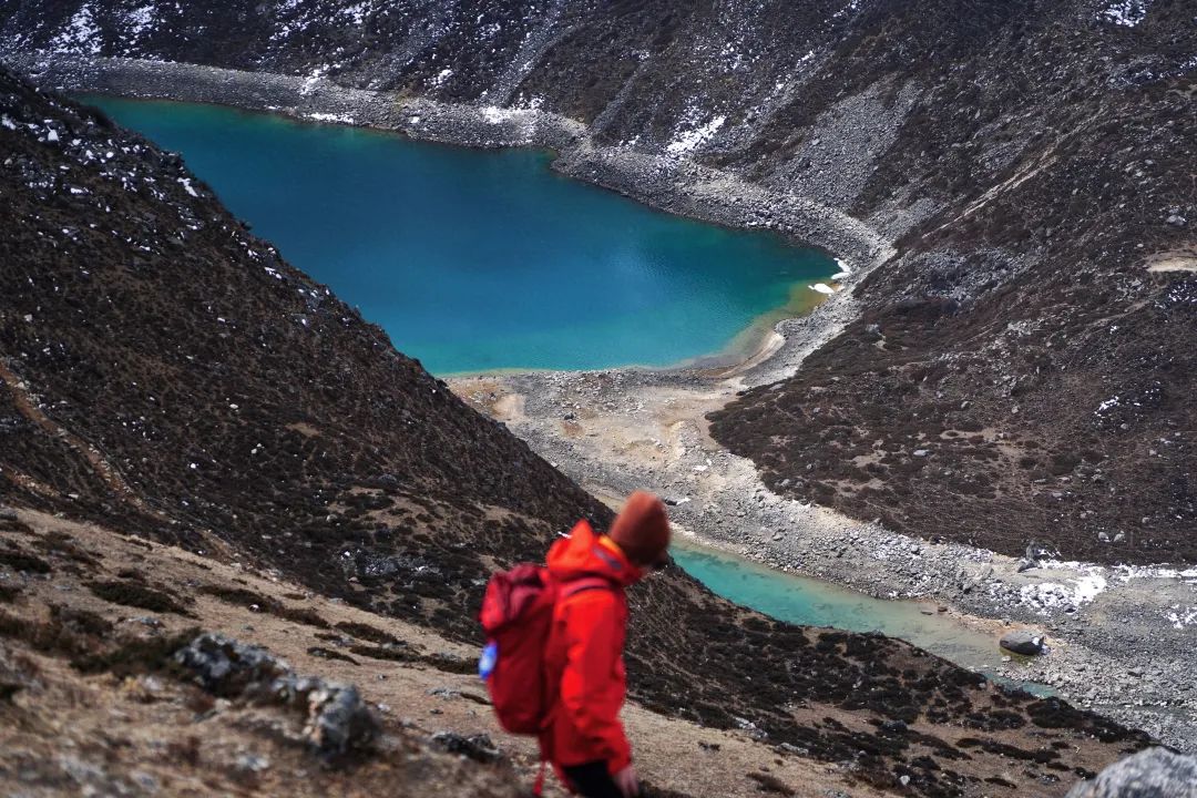 今天一开始的几百米爬升尤为剧烈,海子出现后便基本沿着湖边前行,无太大起伏;到观景台休憩一阵,便要继续沿着碎石特多的小道往山脊上爬。雪山没有现真容,但山腰往下的冰川却密集得让人震撼,期间还看到了对面山脊成群的羚羊。
