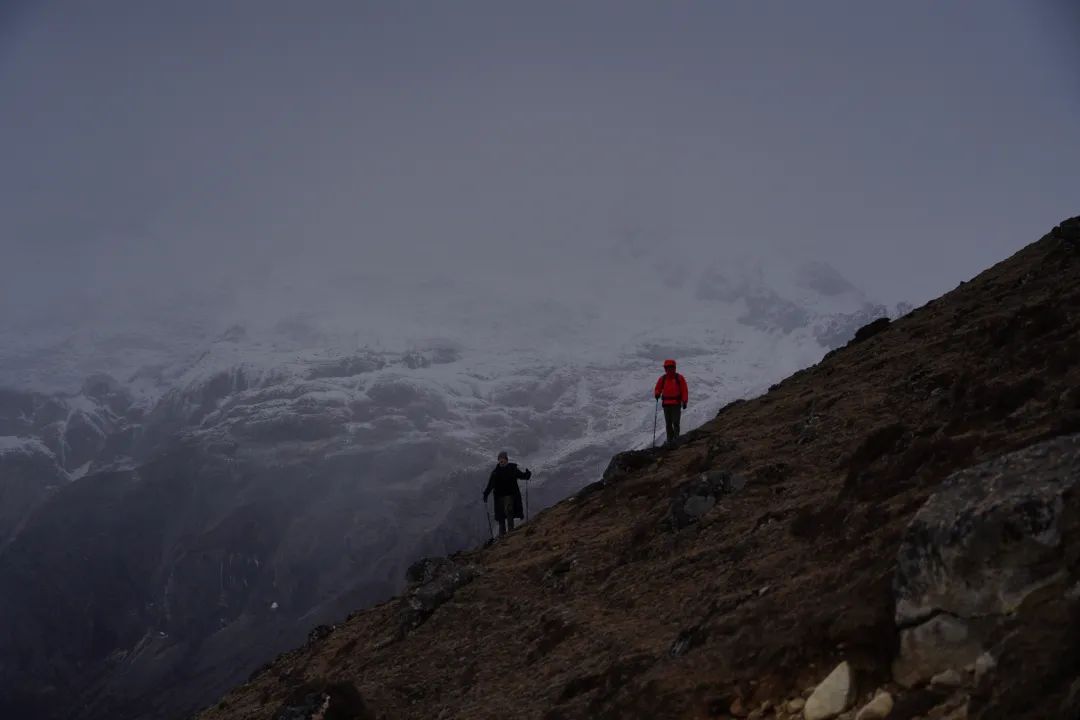 往返约 10KM(垭口海拔超 5000M),累计爬升 400M,天气雪转阴,海拔越高云雾越浓,风大到八成队员没到垭口便折返。