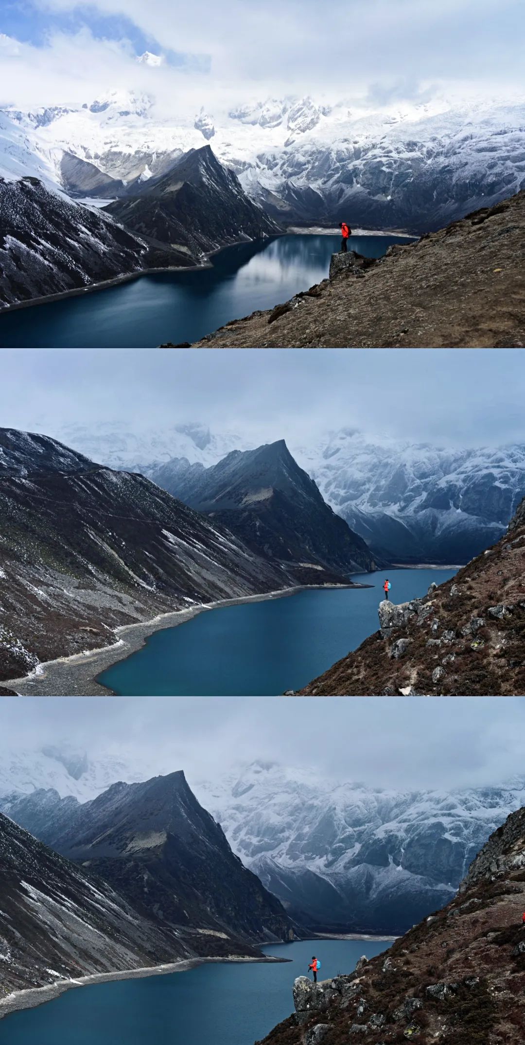 以白马林措停车场为起点,3 天时间往三个方向,见三个湖,三座雪山,总结起来尤为规整的线路安排,天气也尤为巧合地呈现出三个版本。