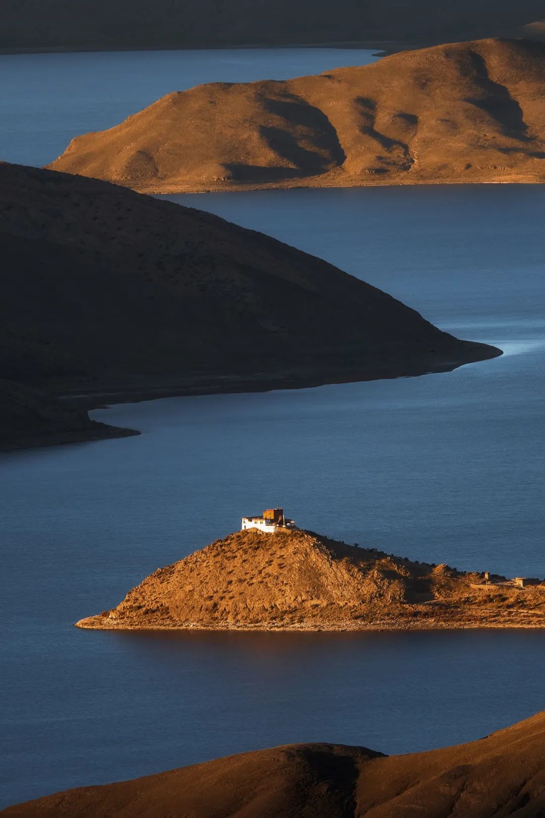 沿湖边栈道往上走到山脊,整个白马林措长条状一览无余,庞大的雪山立在另一侧,开春前的山里秃且冷硬,暮霭沉沉中尤添几分萧瑟,但那也是壮阔的萧瑟!湖水呈现出幽深沉寂的蓝,水冰交界处有着规整的蓝白划分,群鸟略过,湖面平静无波。