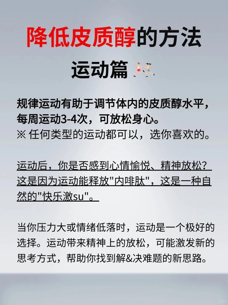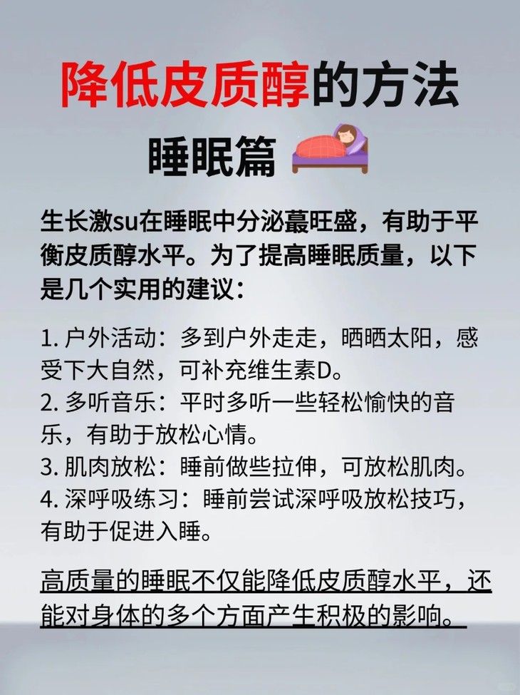 高质量的睡眠和每周3-4次的运动,对降低皮质醇都有帮助~