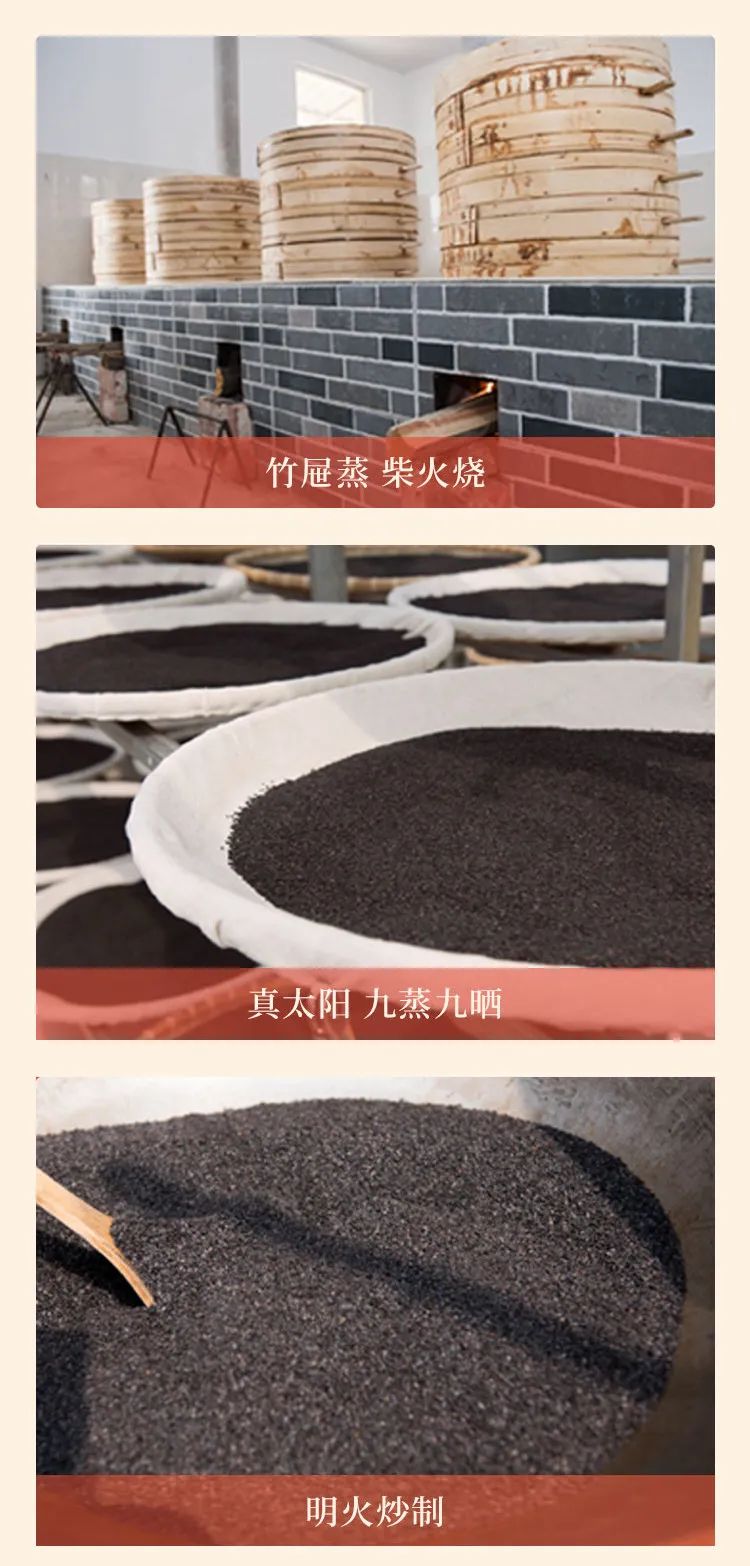 真正的九蒸九晒,传统方法炮制,真正的柴火反反复复,九次蒸制,九次太阳晾晒,这期间黑芝麻充分吸收了太阳的光照,充满了太阳的能量。