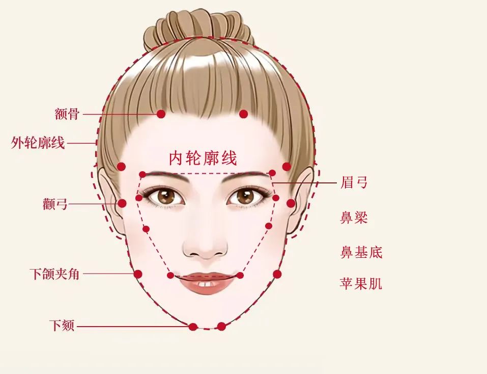 外轮廓,包括在下巴、下颌角、太阳穴、面颊、颧骨、发际线、耳廓等部位,主要集中表现在下巴短后缩、面部线条不够流畅,凹陷明显。