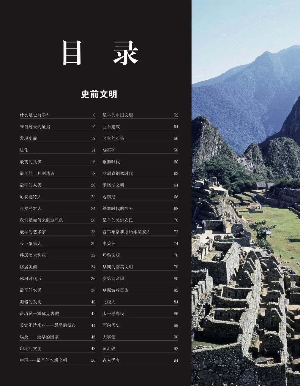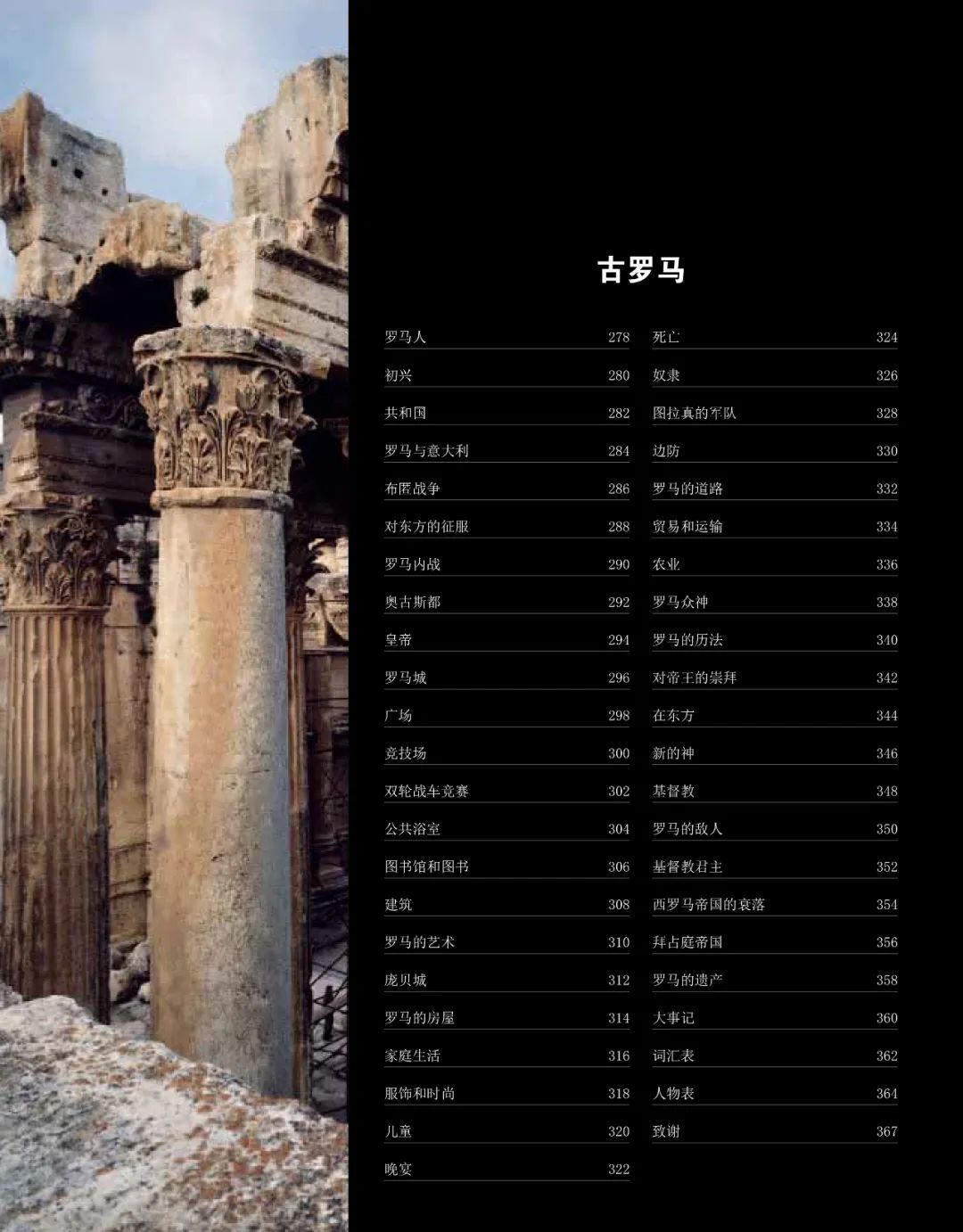 全书知识体量相当大,主要通过史前文明、古埃及、古希腊、古罗马4个部分来讲述人类文明进程。