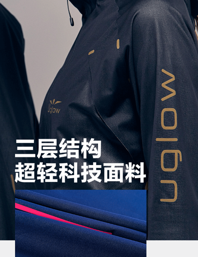 UGLOW极轻冲锋衣采用的三层结构超轻科技面料,具备防水系数10000mm和透气系数10000mm的双重指标!