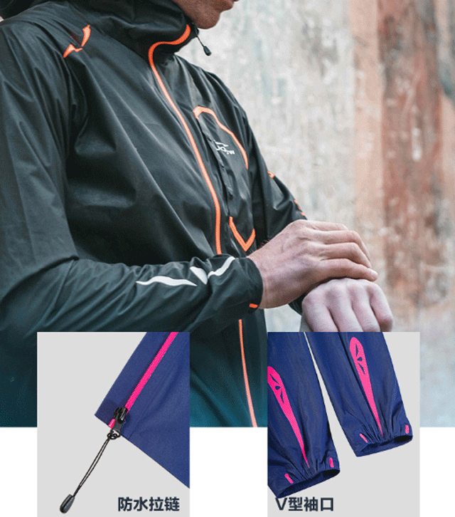 在容易磨损的袖口处,进行了特别加固处理与弹力紧缩设计,可与手腕紧密贴合,有效防止雨水、冷风的灌入,还能更加方便穿脱。