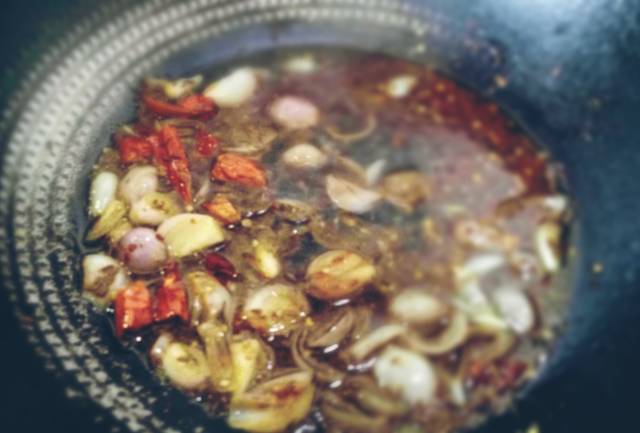 4、热锅凉油,微微起烟,放入适量干辣椒段,葱花、蒜瓣,1平勺郫县豆瓣酱,翻炒出红油;