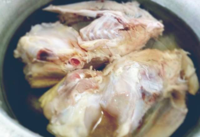 3、鸡架在锅中停泡半小时后出锅,掰成块,根据个人口味调味,待用;