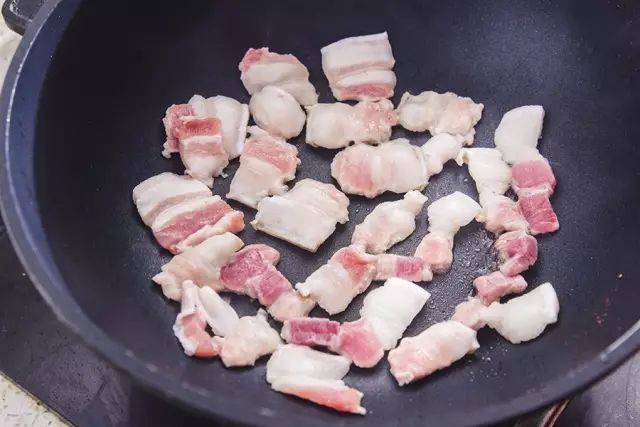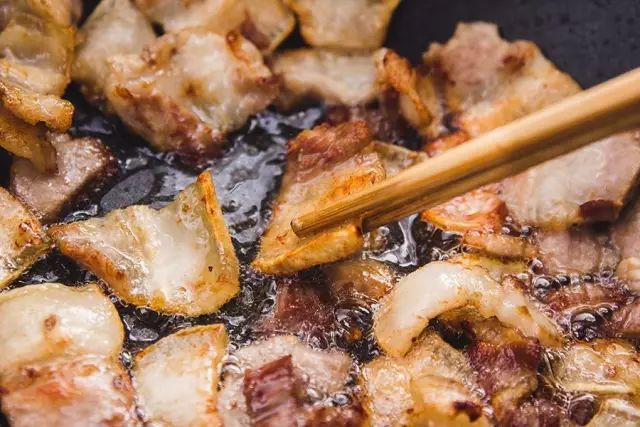逼出一部分猪油,煸至肉片两面变成金黄色,边缘微微卷曲。