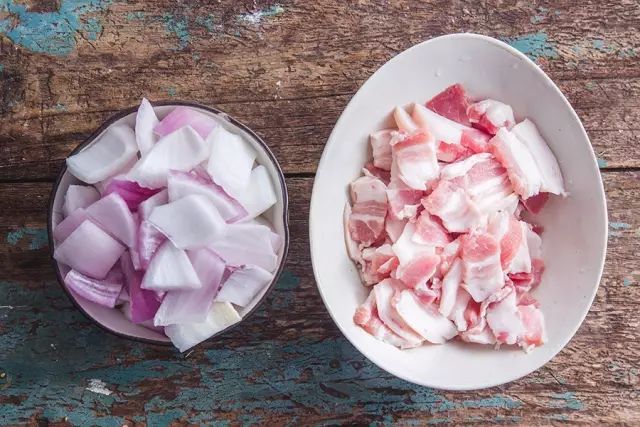 ▼ 1.处理材料 :将五花肉切成5mm左右薄片,洋葱切块。