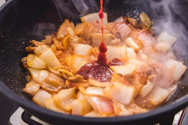 ▼ 5.加辣酱 :加入3勺韩式辣酱和少许热水,翻炒均匀后盖上锅盖焖煮,直到收汁。