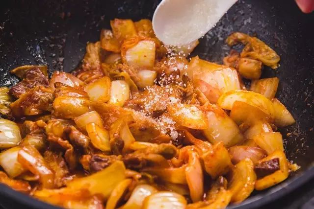 ▼ 4.加泡菜 :加入辣白菜和适量汤汁,继续翻炒均匀。
