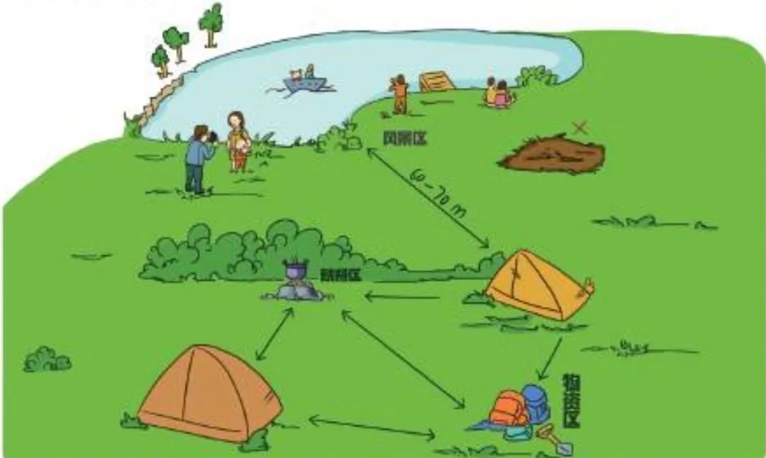 对露营进行合理布局规划,建议采用三点规划法,即三个点分别是用餐区、物资区、休息区。