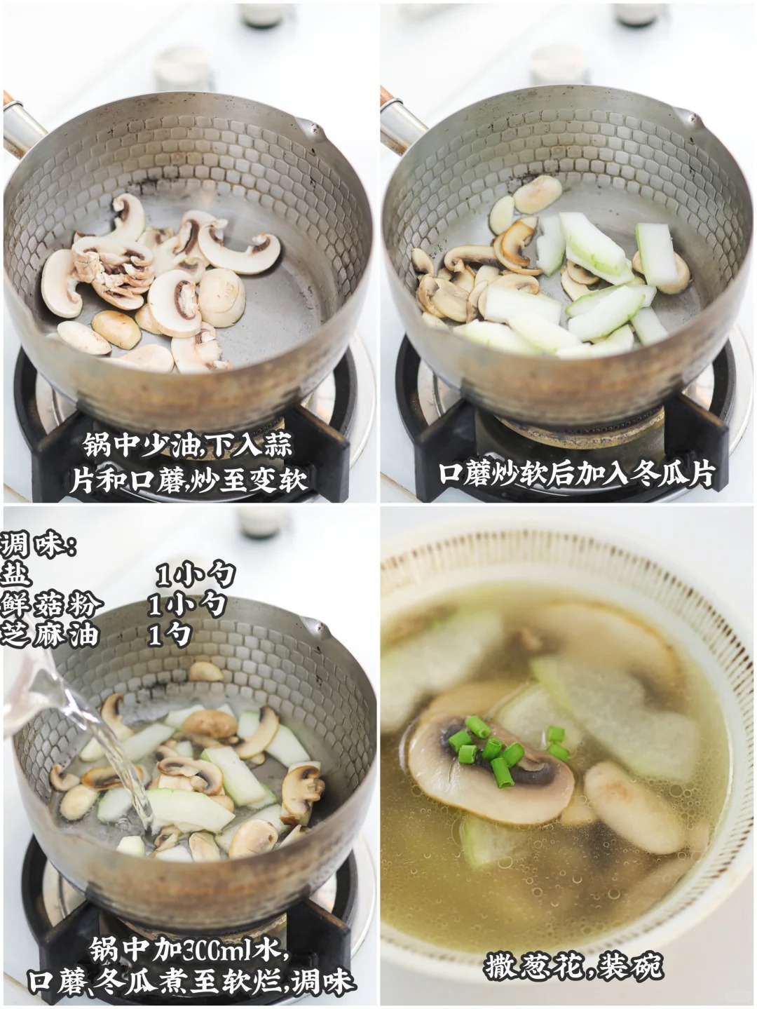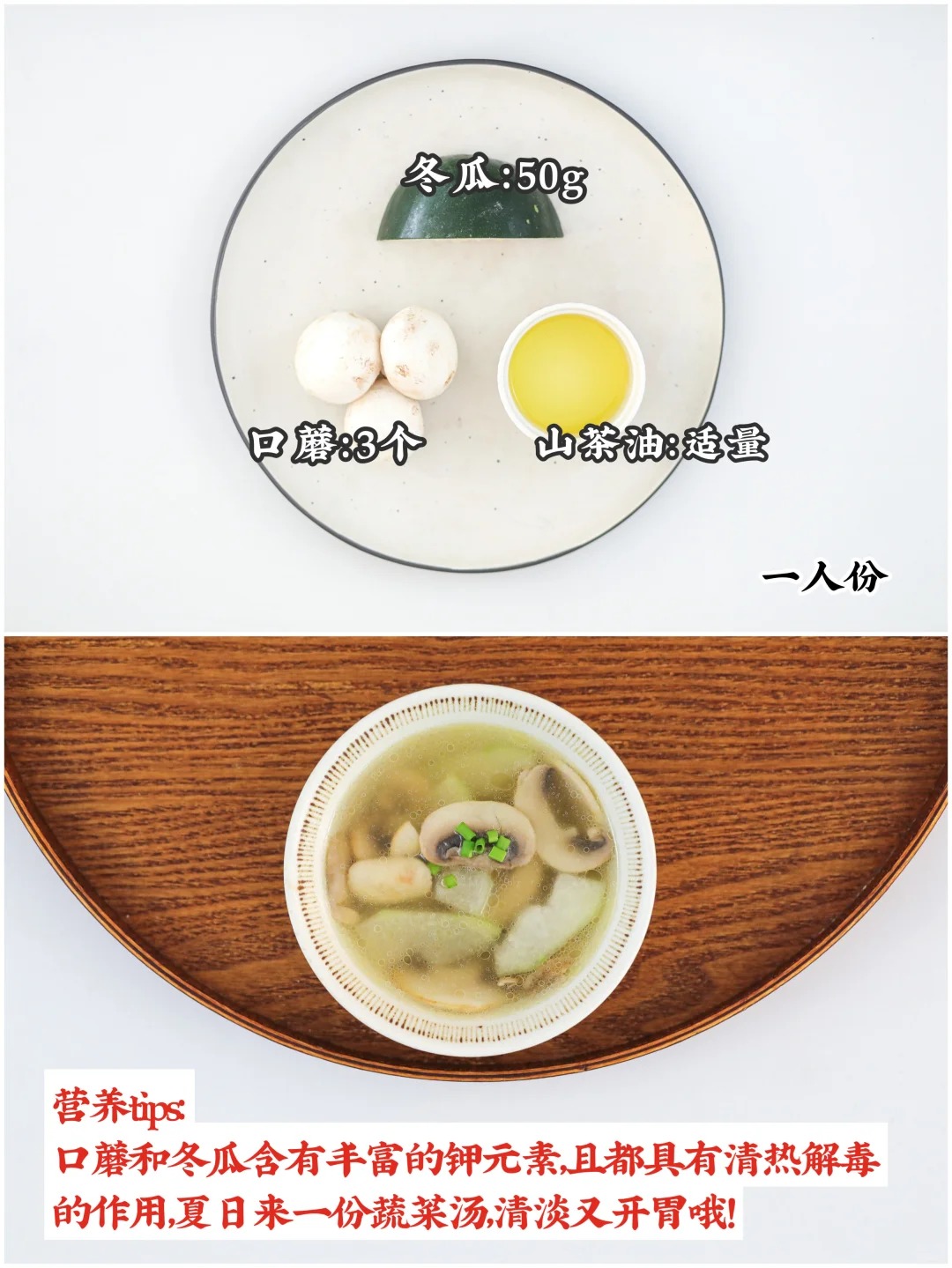小宝宝建议口蘑、冬瓜切小丁煮软,清热润肺,肠胃无负担~