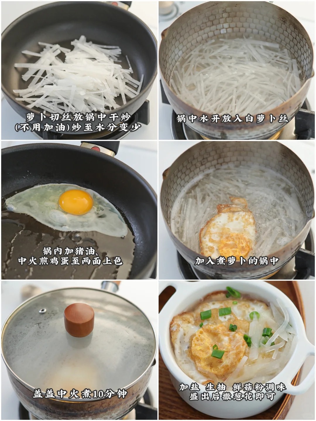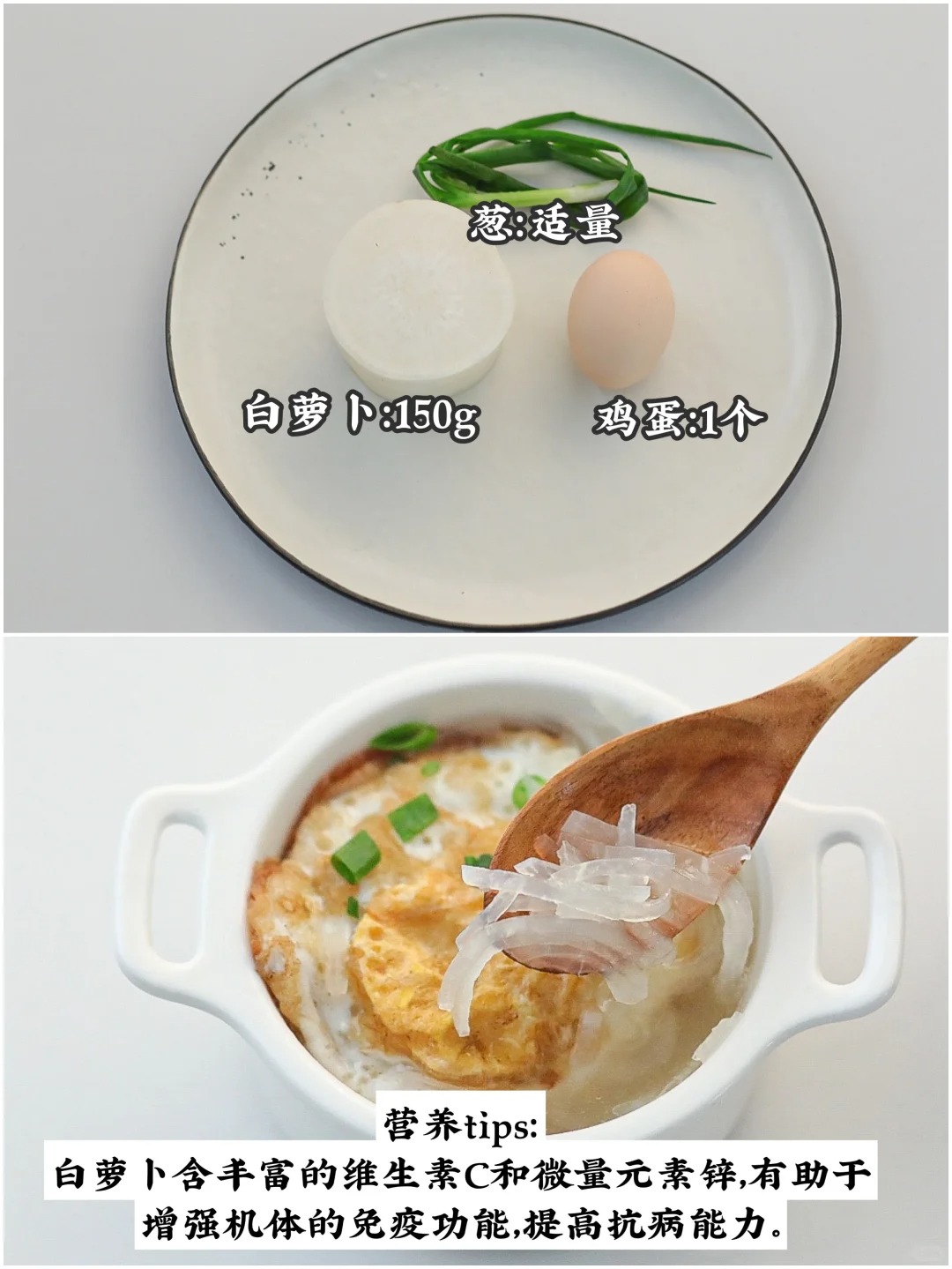 小宝宝建议将煎蛋剪细碎至无噎呛风险,萝卜煮软更易吞咽,清甜润喉~