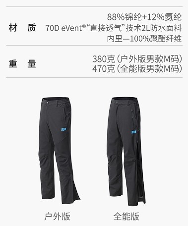 【全能版】加长侧开拉链。面料略厚一点,口袋带防水拉链。【户外版】裤脚加长拉链。