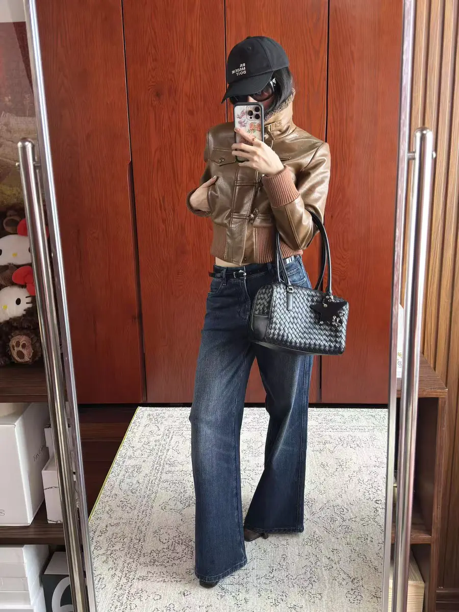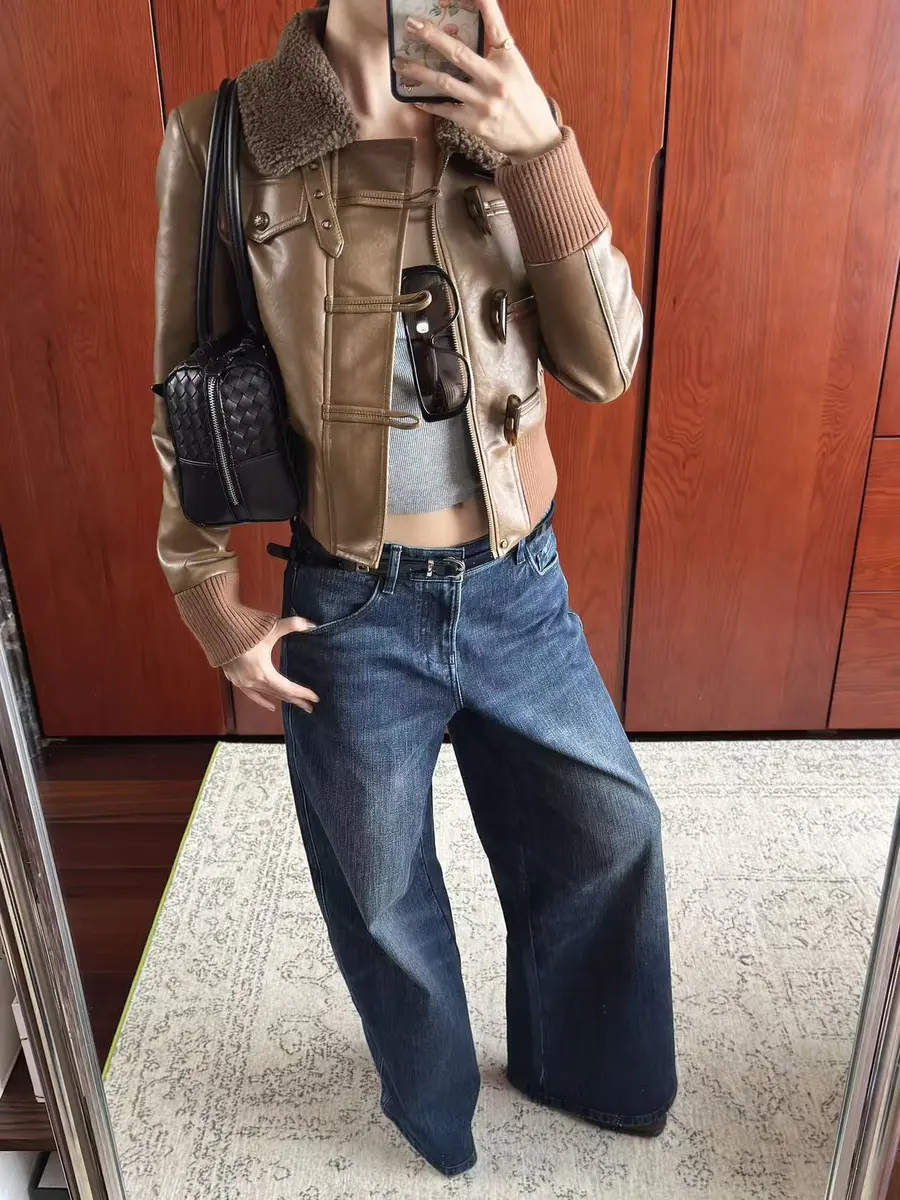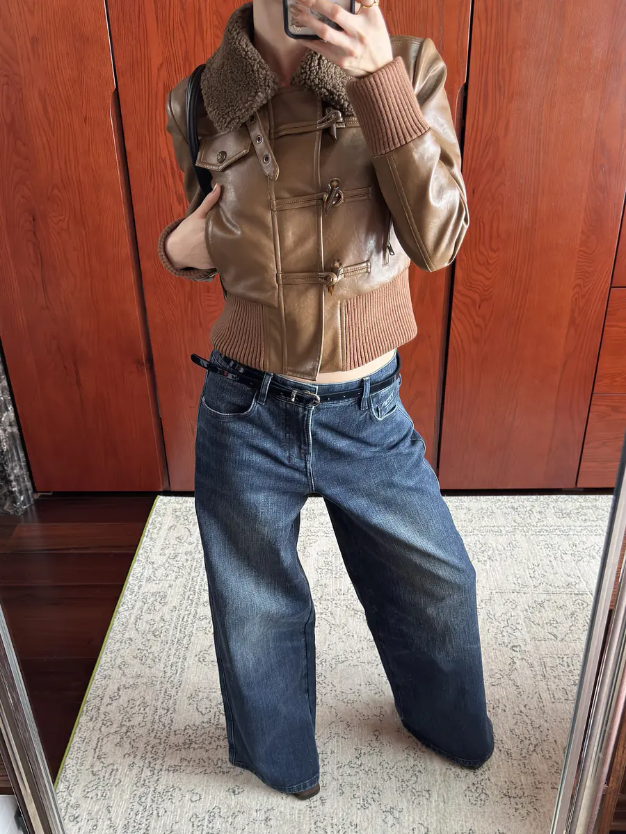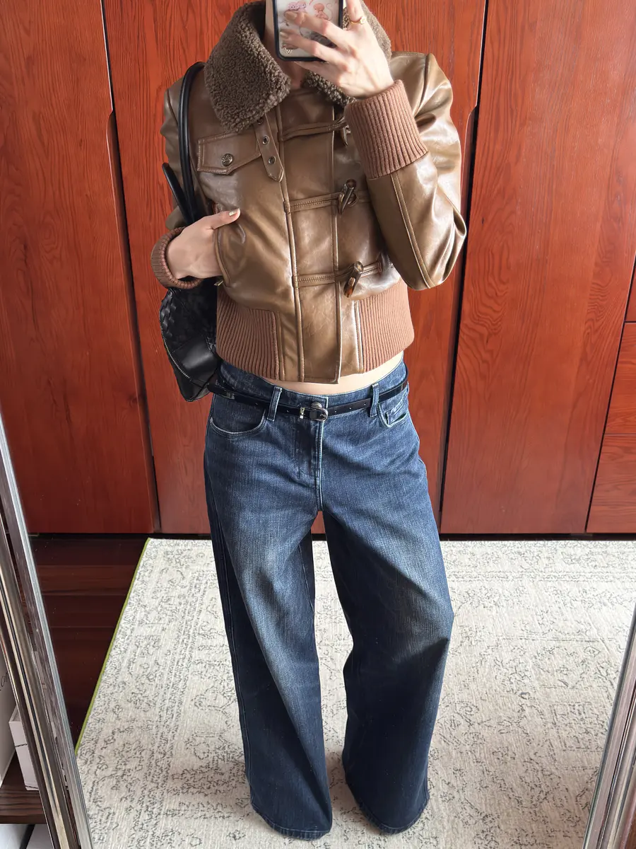 新品上身 | 羊羔毛领皮夹克,搭配经典牛仔裤,冬日也能时尚在线。