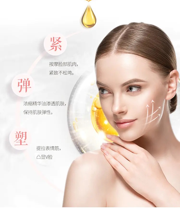 2.将小V油从地仓穴(嘴角旁)到听耳穴(耳垂前)以按压打圈的螺旋方式按摩,重复6次。【提拉】