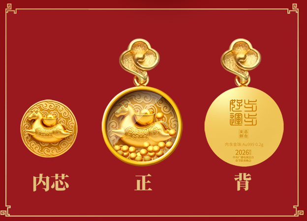 它采用铜镀真金材质,同样内置迷你转运珠,正面唐马造型依旧源自官方获奖图稿,由非遗匠人手工绘制细节,栩栩如生。