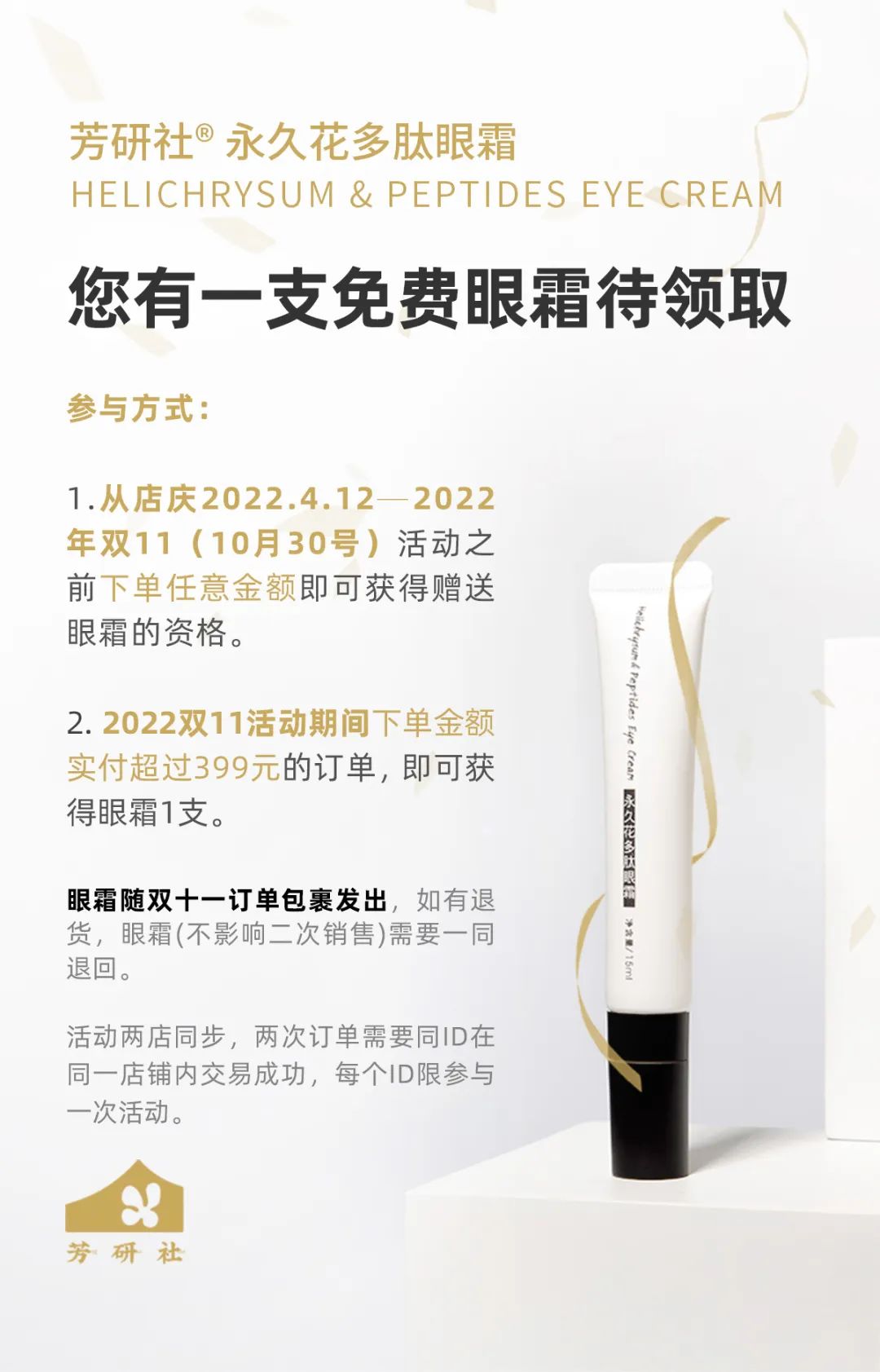 a:从店庆2022.4.12——2022年10月30号之前,下单任意的金额,即可获得赠送眼霜的资格