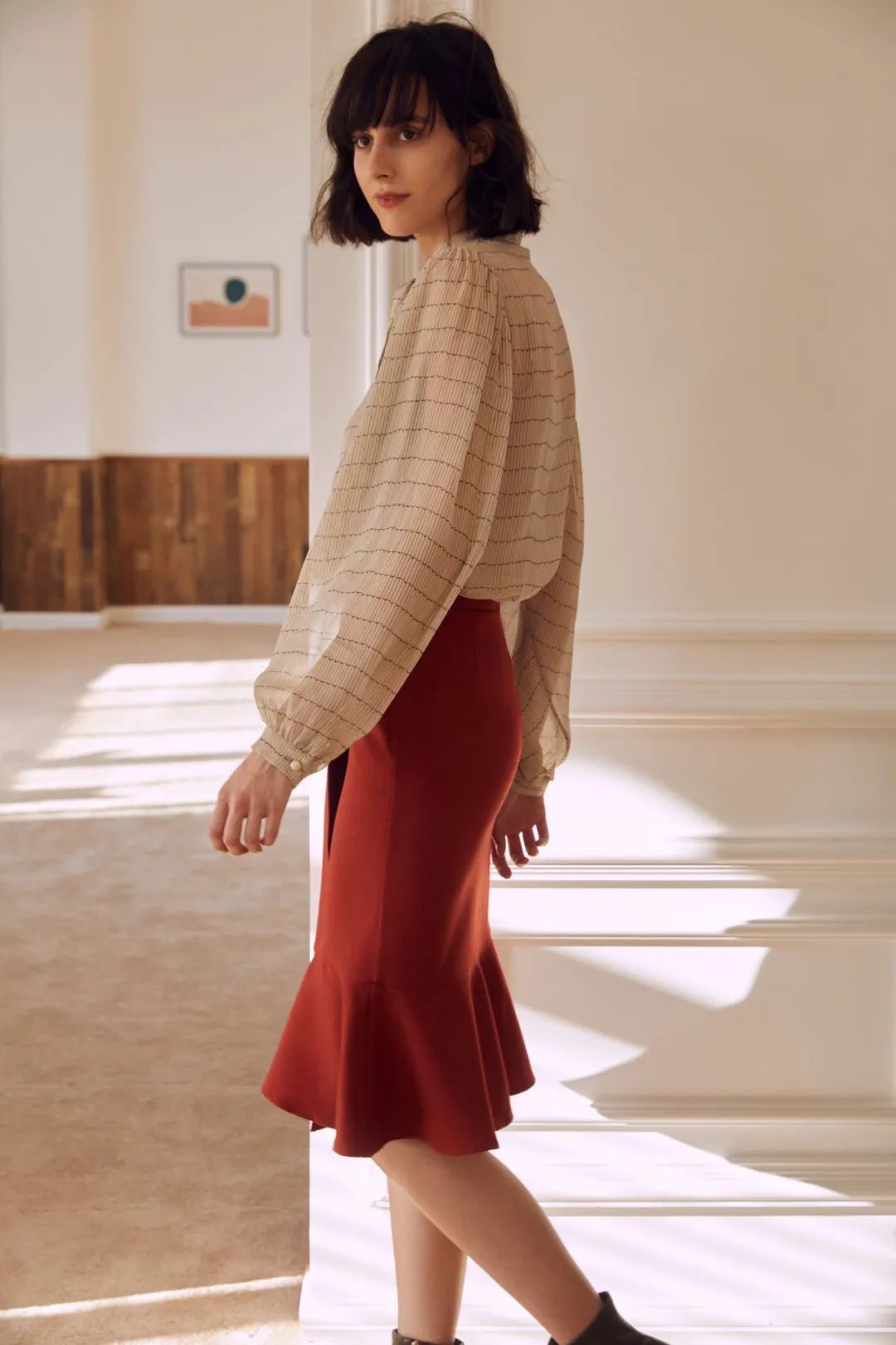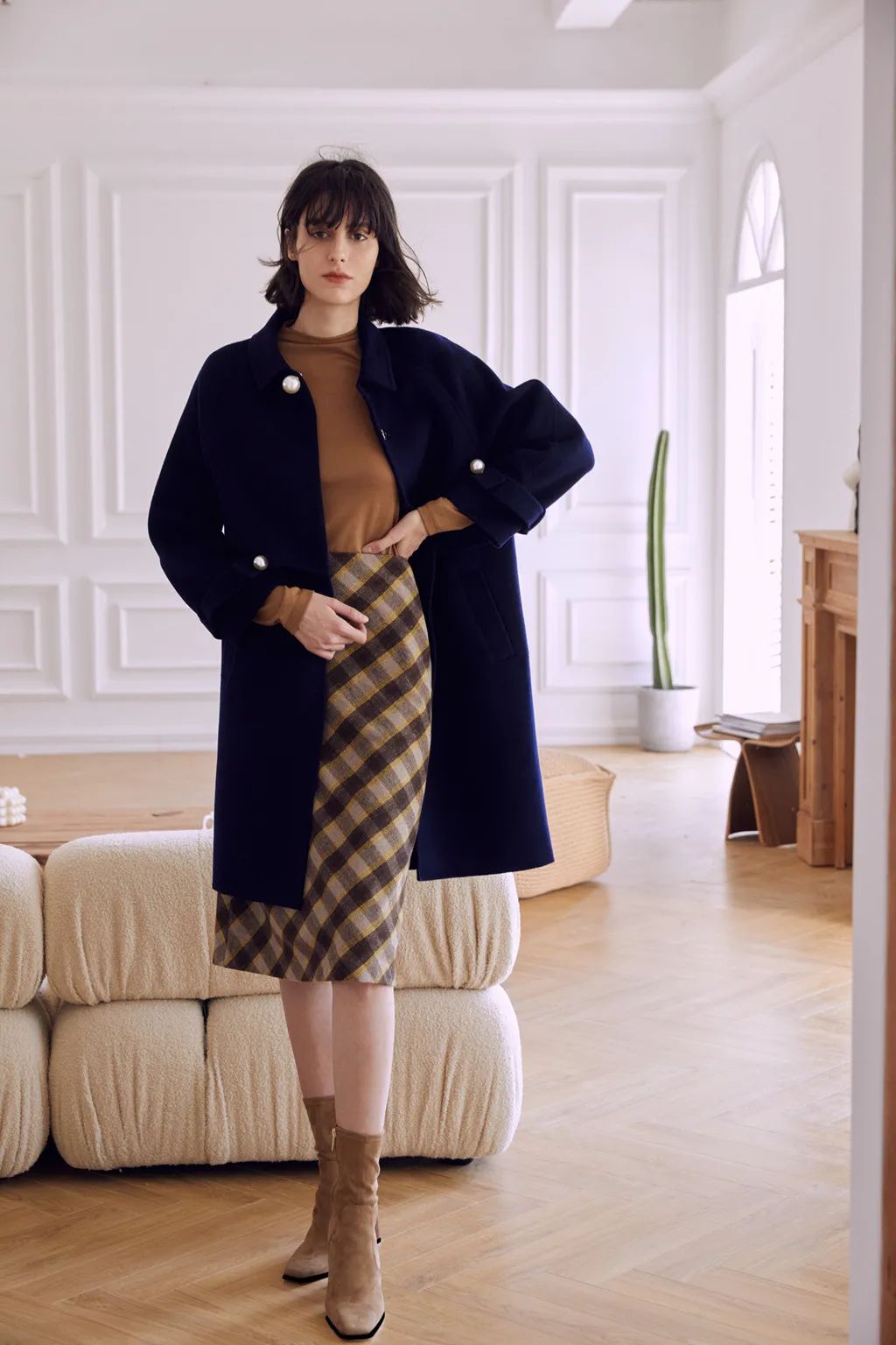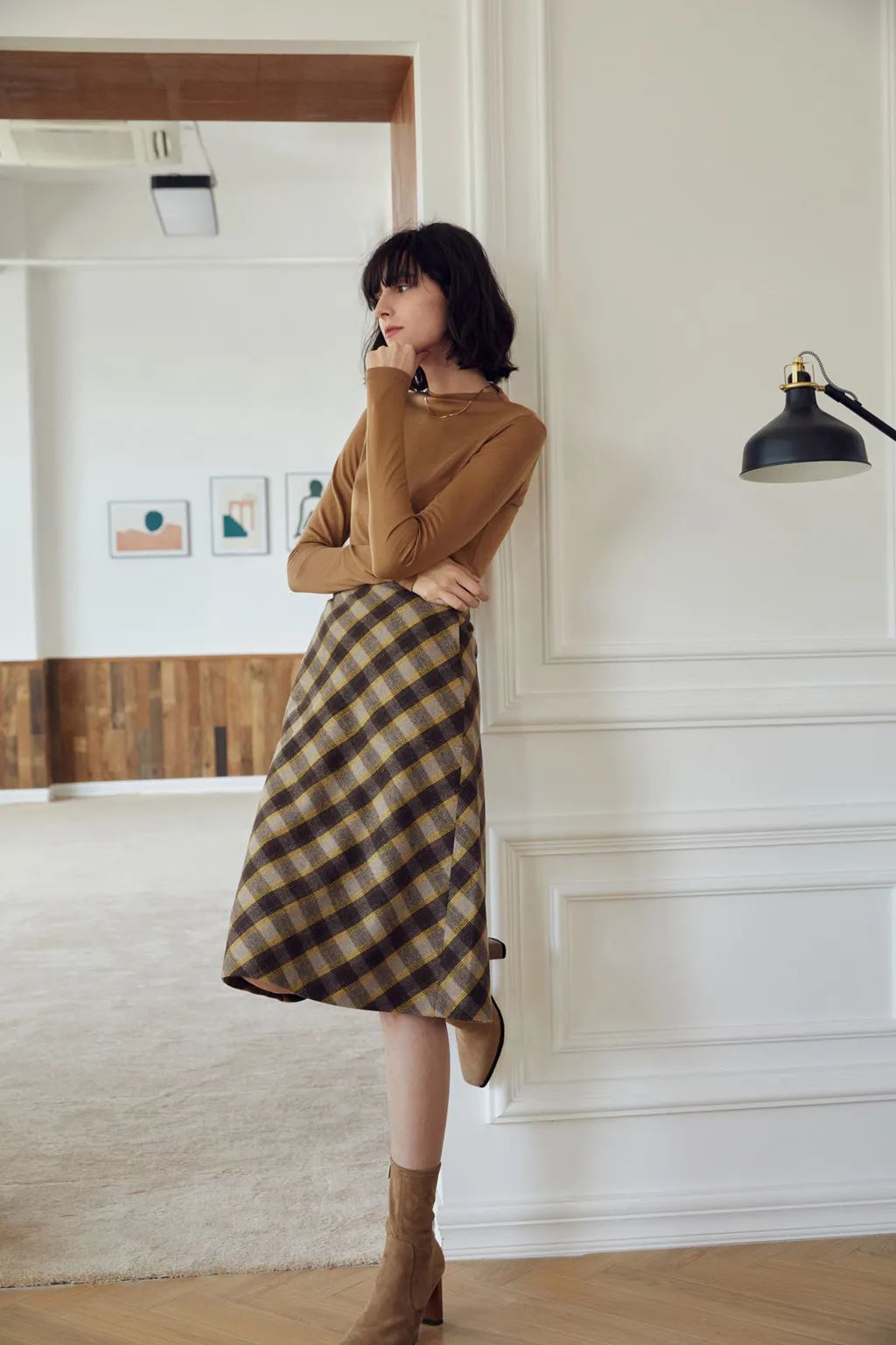 姜黄色的格纹半裙,复古风满满。小A字的版型不挑身材,精致优雅。