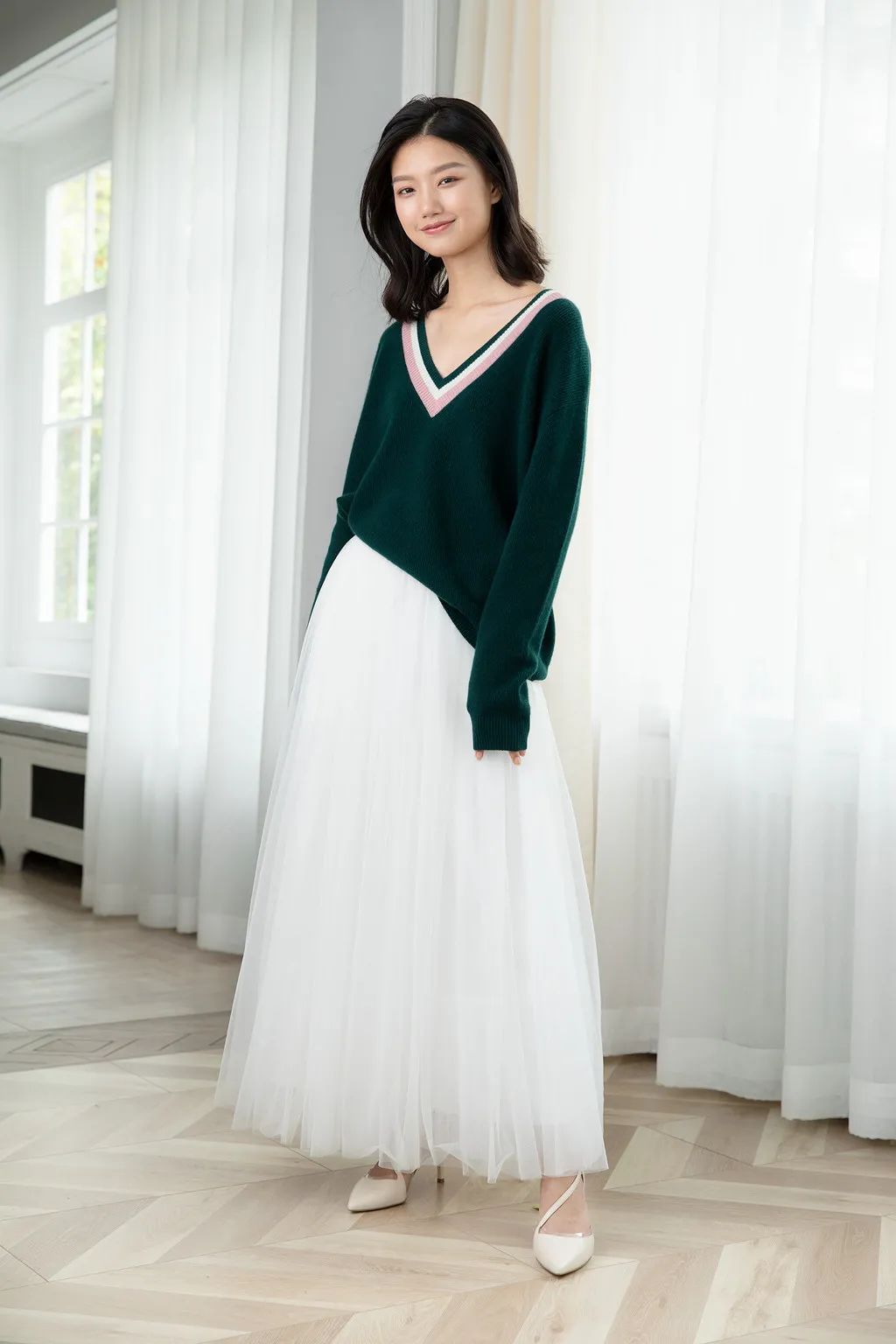 墨绿色更显优雅,搭配纱裙有别样的韵味。
