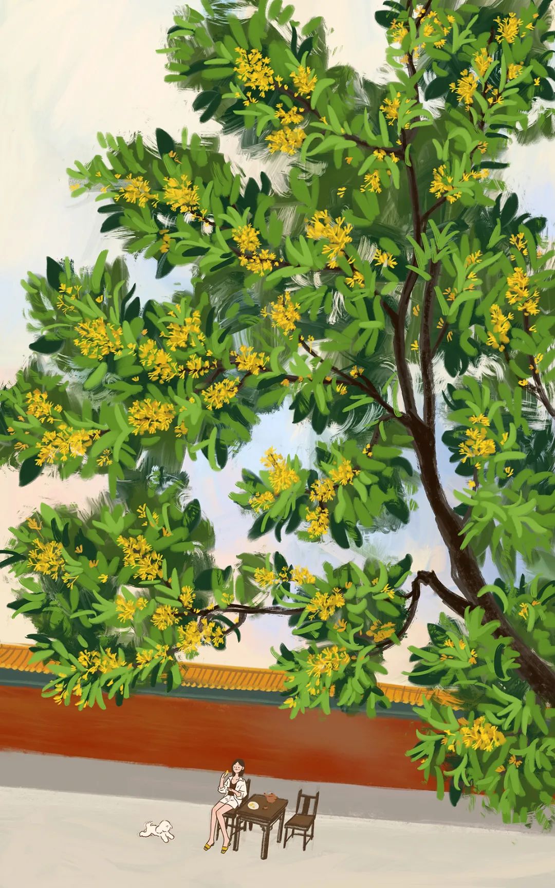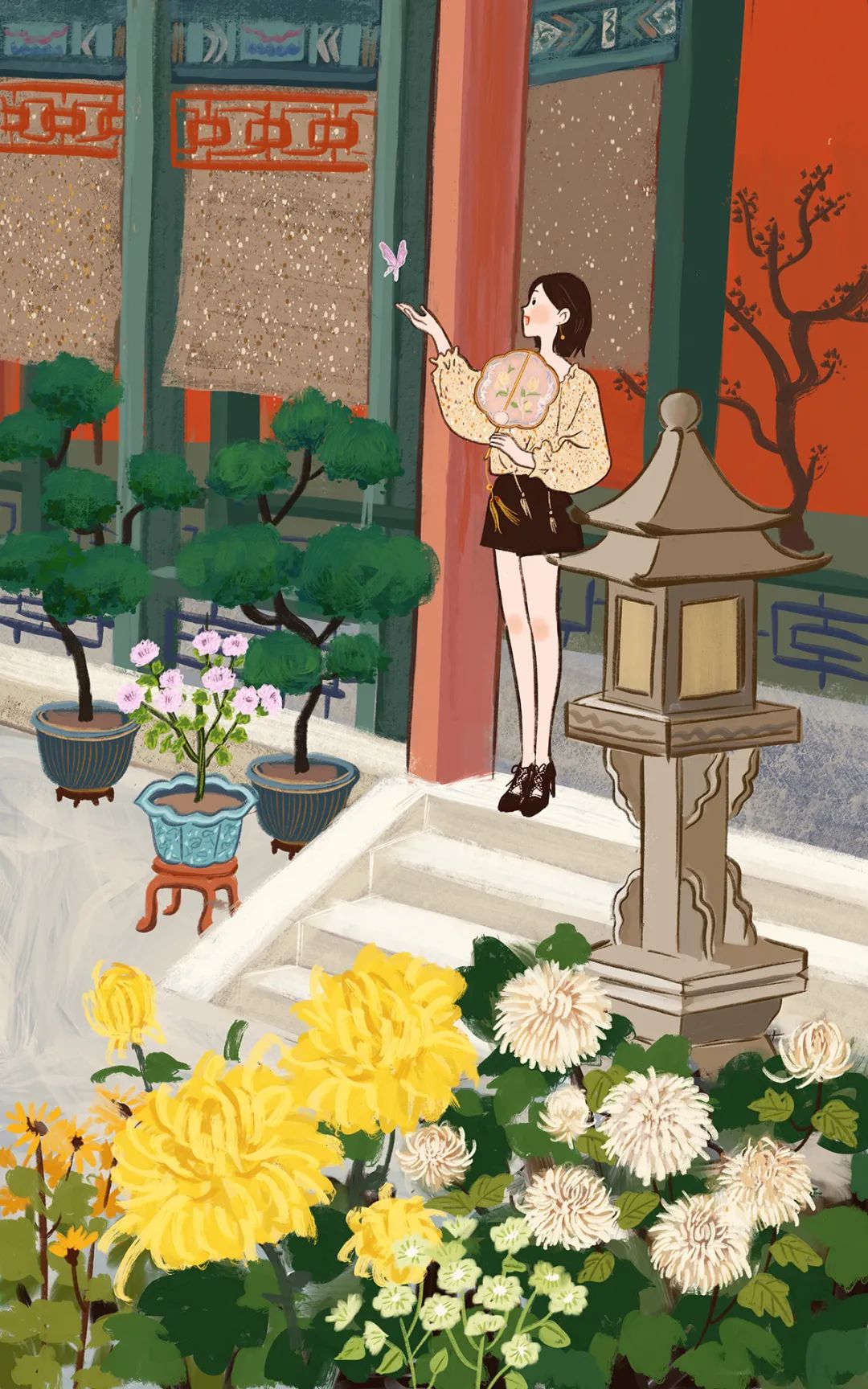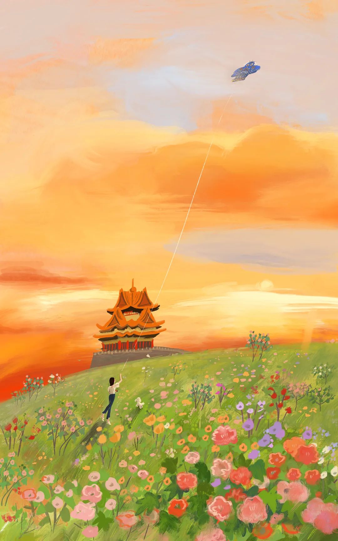 儿力力笔下的宫廷四时花景,治愈又美好。之前剧透过的这张,是很多人很喜欢的一张。角楼静静伫立,风筝飞舞在天际,瑰丽的晚霞和明媚的芙蓉花相呼应,画面和色调让人心旷神怡。