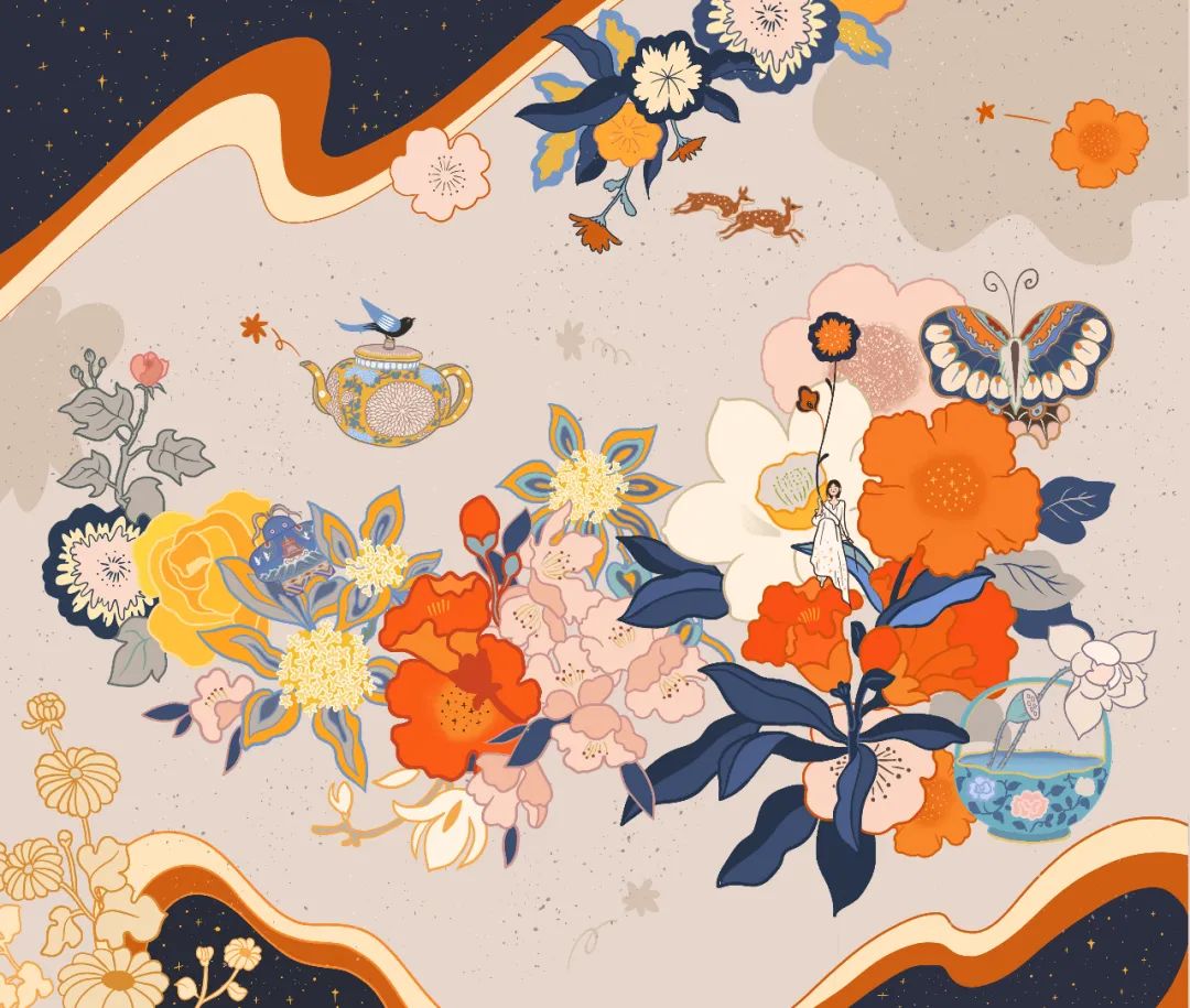我们工作室的插画师儿力力也由此得到灵感,结合了百花绽放和星河元素,最终呈现出这个浪漫而美好的「花花世界」。