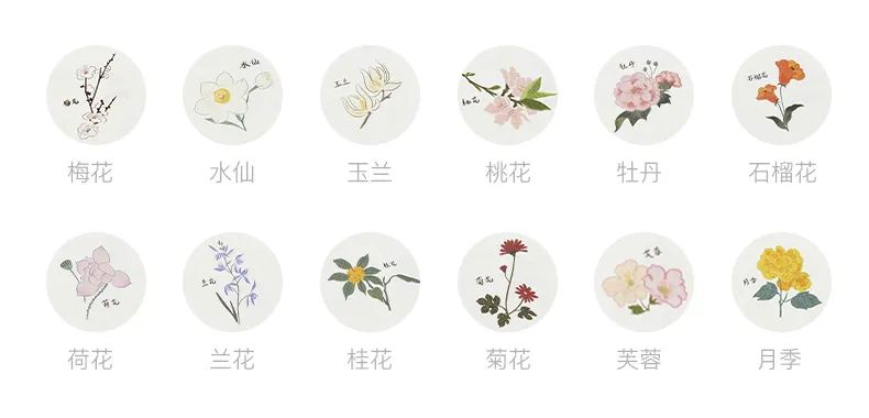 仔细看,封面上有芙蓉、石榴花、水仙、桃花等等,没错,它们都属于宫里的“十二花神”,每个月份都有不一样的美。