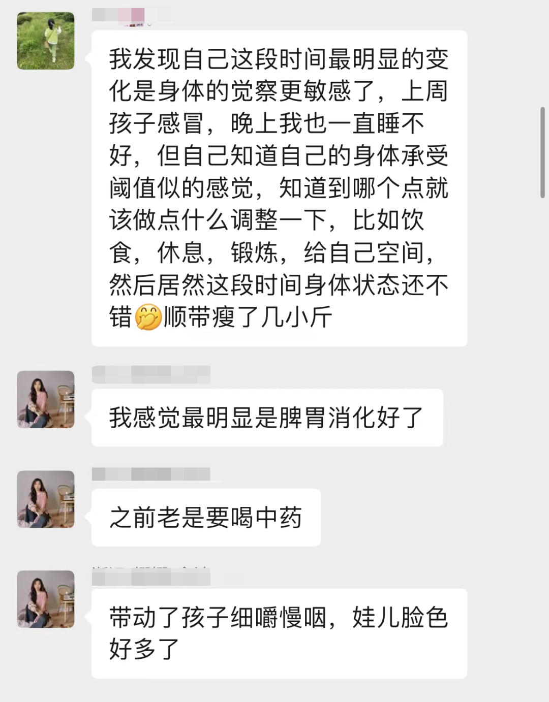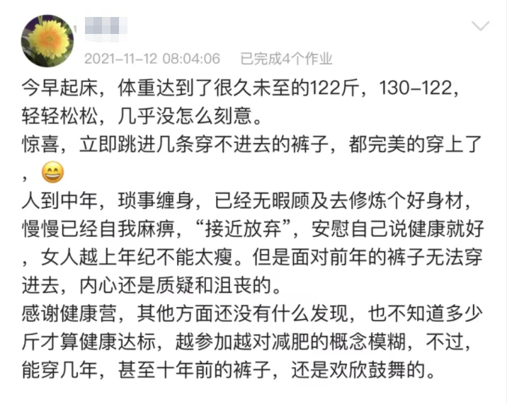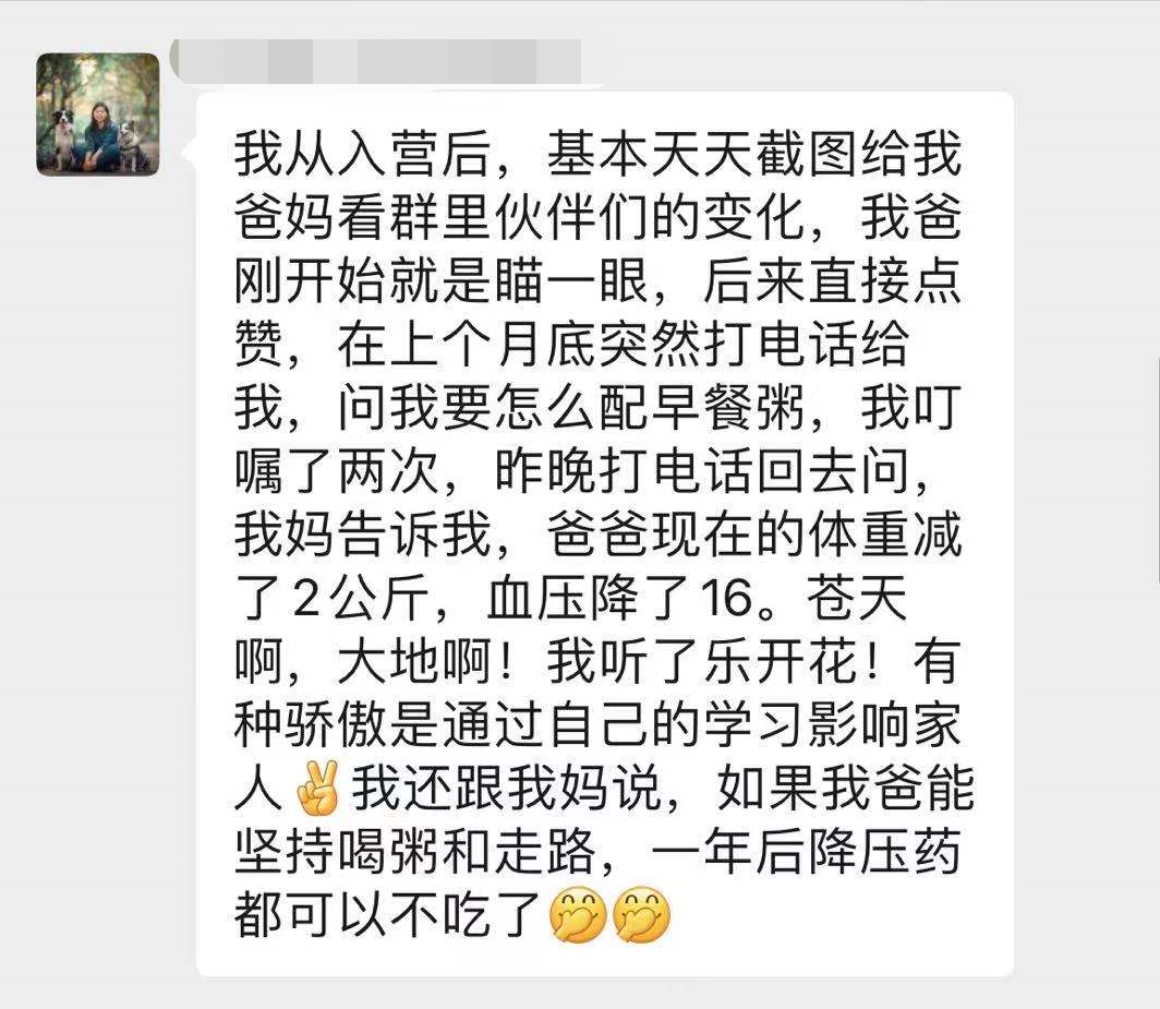 第一期的减肥营满满的干货,让我明白需要从“吃、睡、练、心”四个维度去着手,让我开始喝早餐粥,开始每天保持运动,开始每天早睡……
