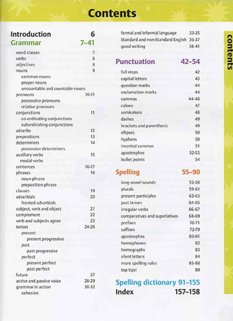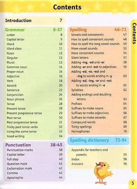 这套书的目的主要是提升小朋友的写作能力,所以Contents融合了英语写作必备的语法知识、单词拼写和标点符号三大部分。我们分别来看下。
