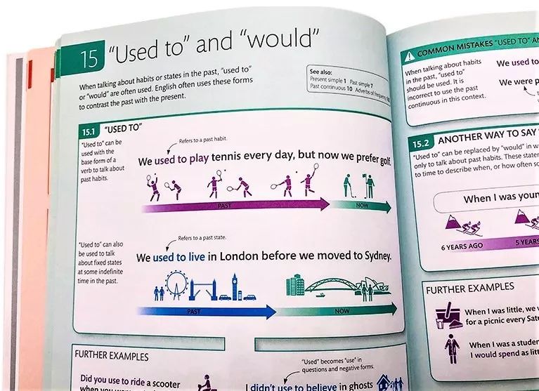 Used to在语法中解释为“过去习惯做...”。书本里特别画了“时间轴”,来表示动态概念,区分过去与现在,并画了两种运动方式来表示过去现在的不同,一目了然。