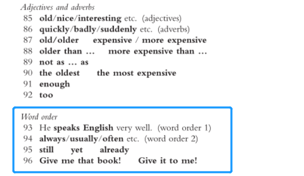 ** 例如上图所示的是红宝书内涉及的word order章节,目的在于让初学者了解英语句子语序规则,这个是非常基础的概念了。而在蓝宝书里面是不涉及这方面语法点的。