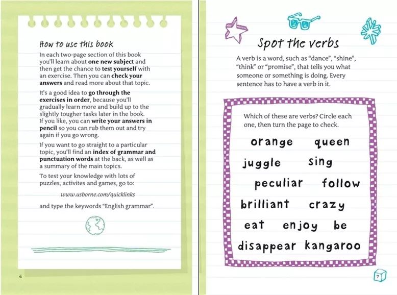 “Junior Illustrated Grammar and Punctuation”是属于“The Usborne English for Writers Collection”英语写作工具书套装中的一本。顾名思义,这本书编写思路和内容选材是为了提升小朋友英语写作能力的。