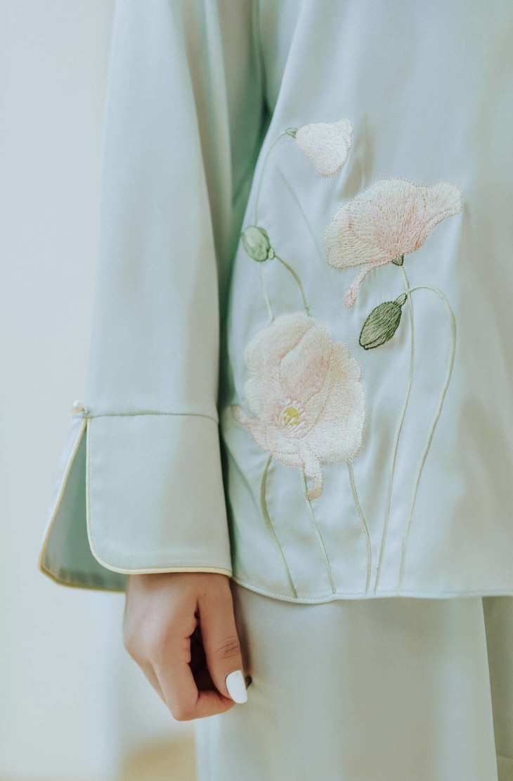 √ 提取花朵颜色,撞色嵌条镶边,整体中国风设计,还原中国丝绸的美;