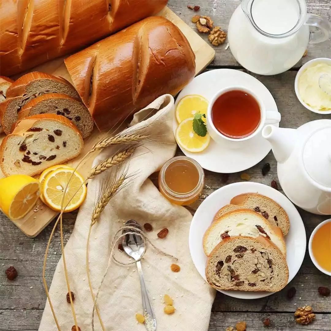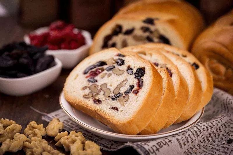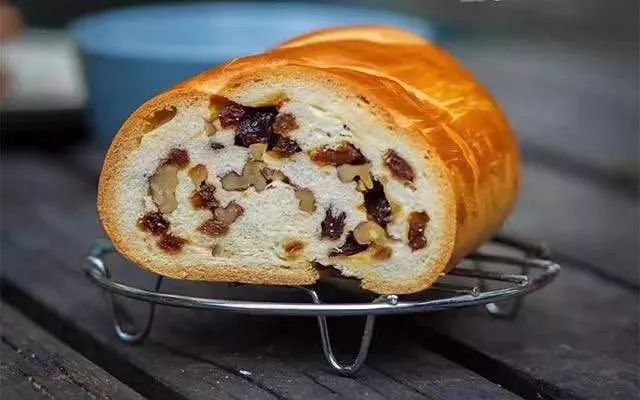 表面被烤制的金黄焦脆,酥油在表面形成焦香的一层,切开列巴,气孔很小,香味扑鼻。面包的纹理特别细腻、绵密,面包周围有一个刀子花开的纹路,扎实的面包里面裹着满满的核桃仁、葡萄干,实实在在!