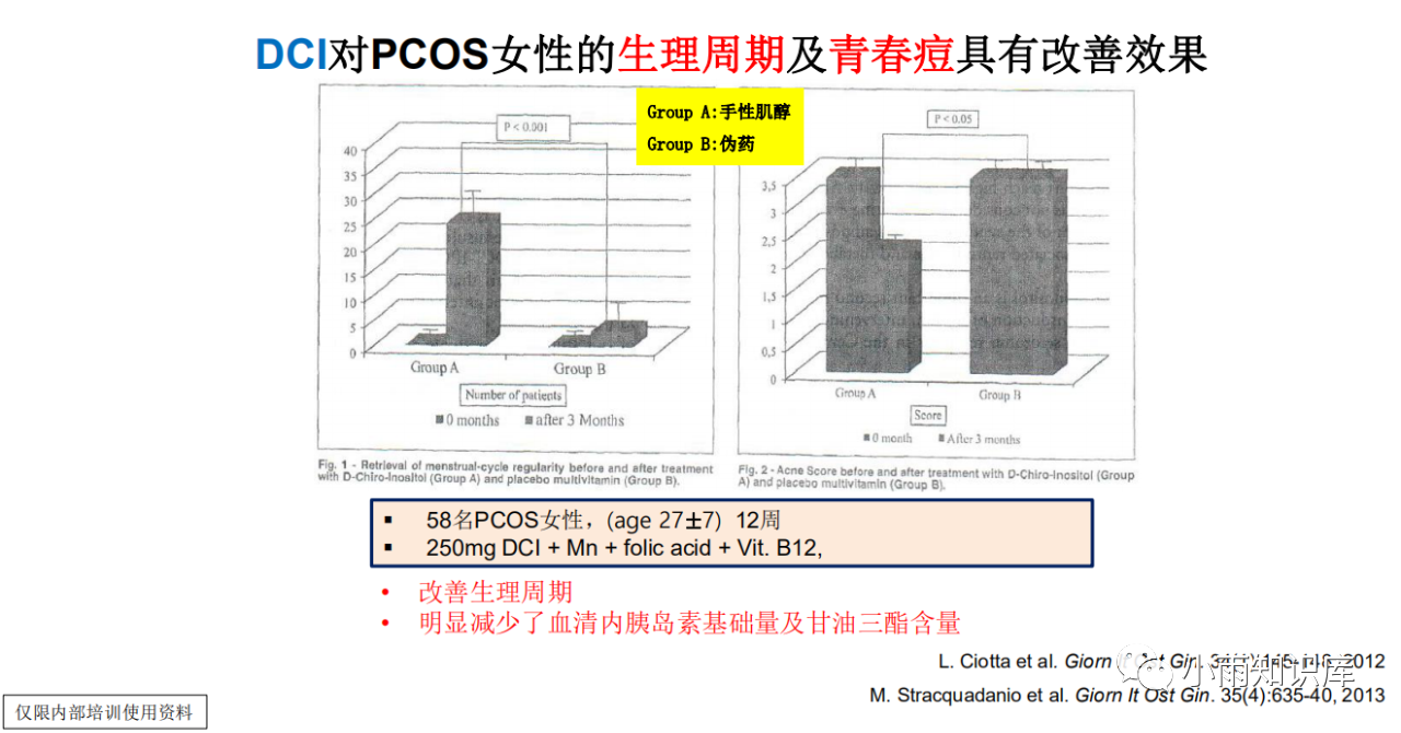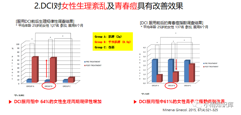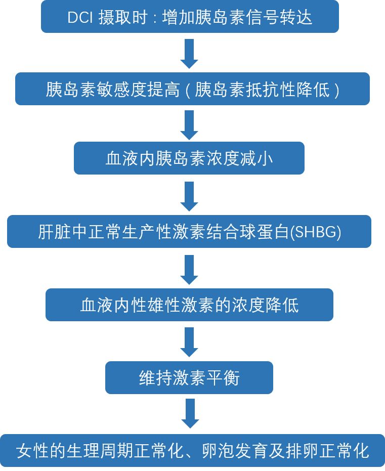 DCI摄取后,可以提高胰岛素的敏感性,使血液中胰岛素浓度降低,肝脏能够正常产生性激素结合蛋白SHBG, 血液中游离的雄激素降低, 从而达到调节女性生理周期规律、 正常排卵等作用。