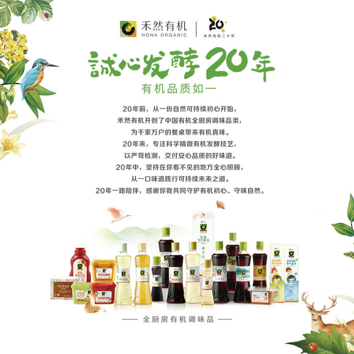 禾然有机20年来不断推动中国有机事业的发展,坚守有机心意,让用自然力量收获而来的自然味道,通过专业科技的精微控制转化为陪伴食物“一生”的天然调味品,这些日常餐桌上的有机调味品,于无声处守护着食者的健康,让更多人在一餐一饭中连接大自然,感受安心真味。