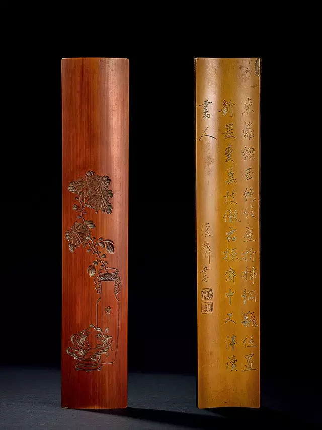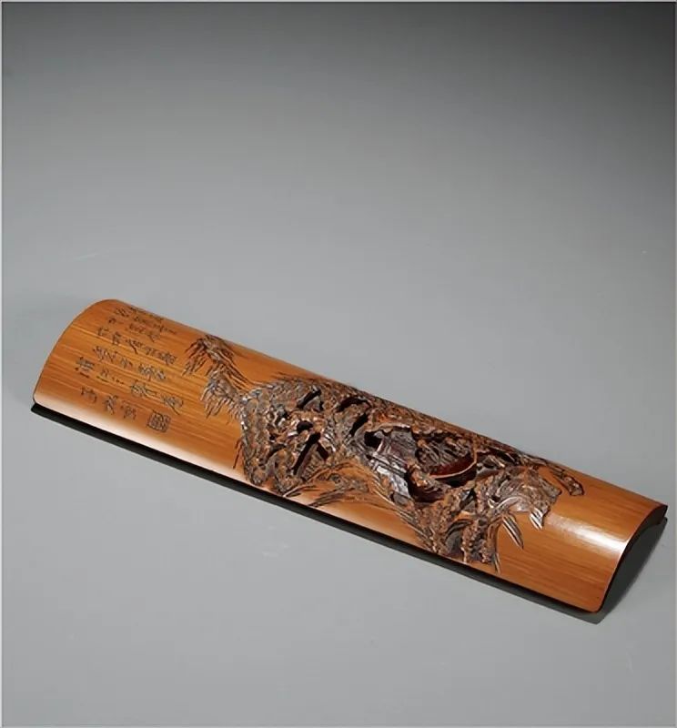 臂搁的造型很多,颇具雅趣,有竹节形的、书卷形的、古琴形的等样式。臂搁表面还会饰以竹叶纹、龙、螭、凤、仕女等纹饰,极其风雅。