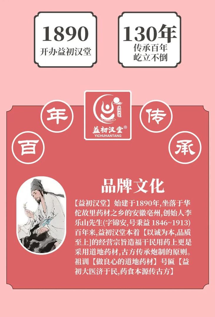 品牌介绍与故事:益初大医濟于民药食本源傳古方一百三十年中医药传承,百年来,祺木粮方本着【以诚为本,品质至上】的经营宗旨造福于民。用药上更是采用道地药材,古方传承炮制的原则。